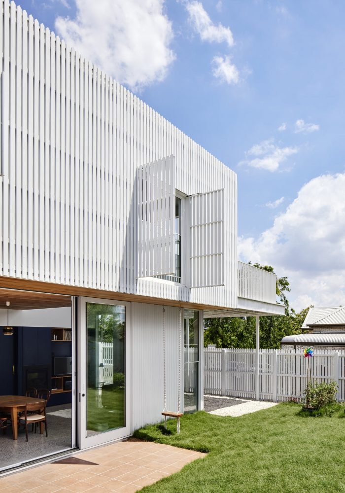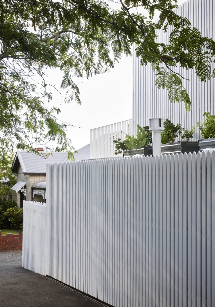 Though it serves to access a total of four levels within the layout of the house, the central staircase appears small and simple, by design. Having relocated the new addition along the southern boundary to maximize northern light, we sought to address the outcome of added bulk along the street. Rather than add on a big high contemporary box, we took a lighter approach, sinking the new addition to reduce the height and embracing the suburban language of the area. White pickets were an early option to creatively reinterpret the need for a new side fence. As the design progressed, the typical fence material of the paling/picket became the external cladding, concealing the lower level wall of the addition on the southern side, and wrapping the entire first floor of the addition.