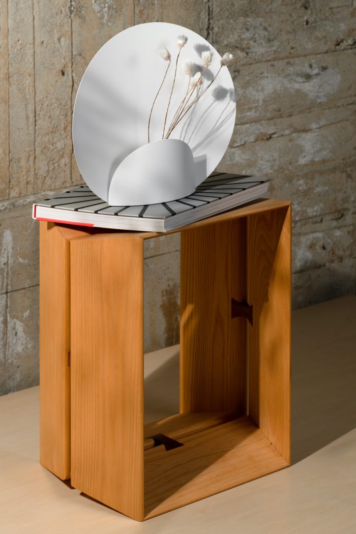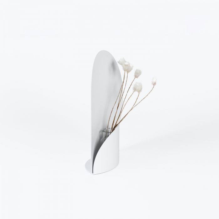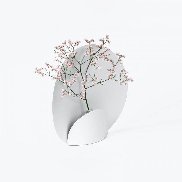 Picture is a minimal flower vase created by Japan-based designer Shinya Oguchi. Intending to show off the beauty of nature, this flower vase was made to capture and frame flowers. Artists are eager to draw flowers because every flower has a different color and shape, as well as a constantly changing condition. The structure is a 0.8mm thick steel plate that is cut and then bent. Furthermore, a smaller circle is added to the front to cover the glass bottle. The bottom is comprised of a thick and heavy steel plate with a thickness of 2.3mm in order to stabilize the flower vase.