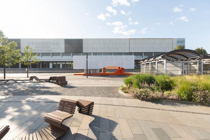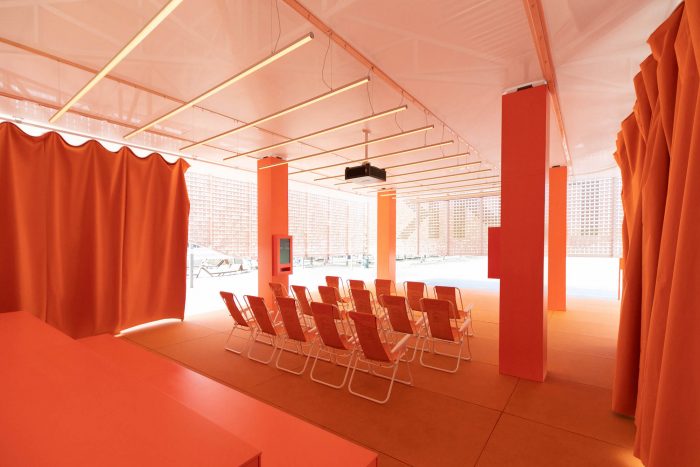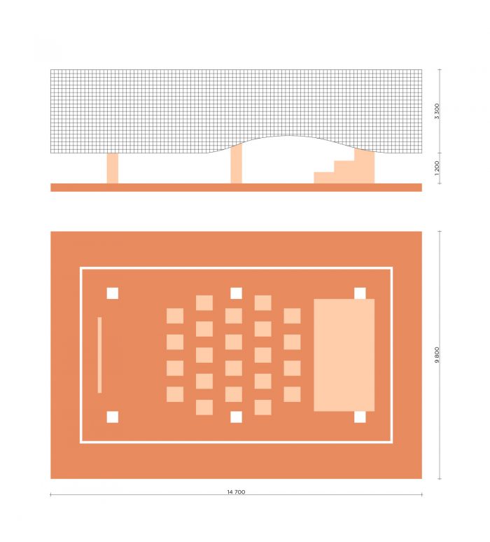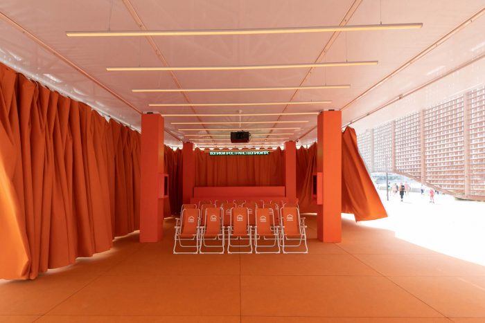 The facade is raised from the ground and forms two entrances to the pavilion on long sides. A large double-sided curtain moves along the perimeter of the facade, allowing to create a cinema inside the pavilion in the daylight hours and protecting visitors from rain during sports activities. Especially for the summer pavilion, a special lifestyle program of events has been developed, revealing the components of the quality living environment and its impact on the city residents. The program includes film screenings, master classes, and lectures. With minimal transformation and thanks to the storage of some equipment inside the tribune, the venue adapts to any of these activities.