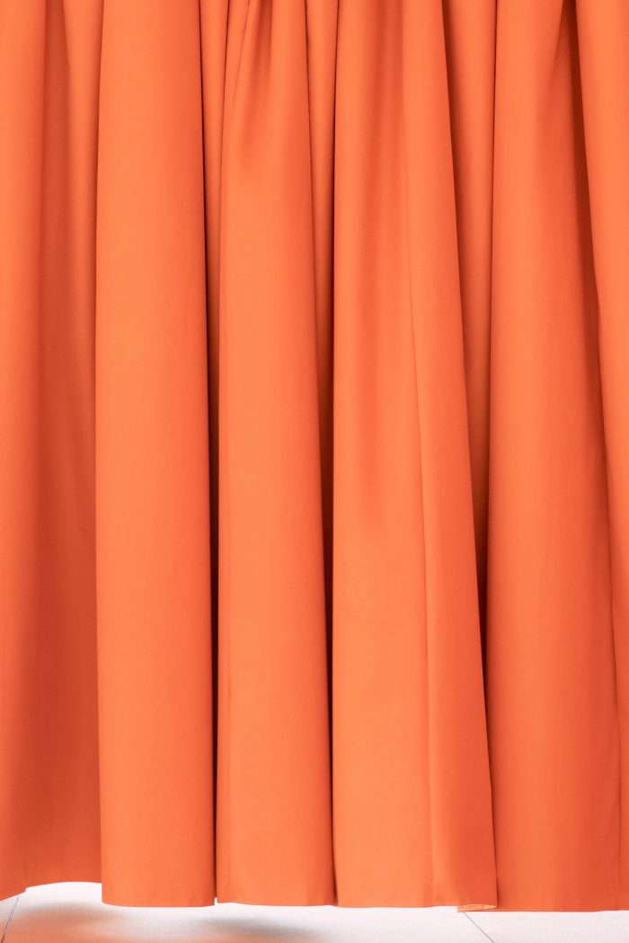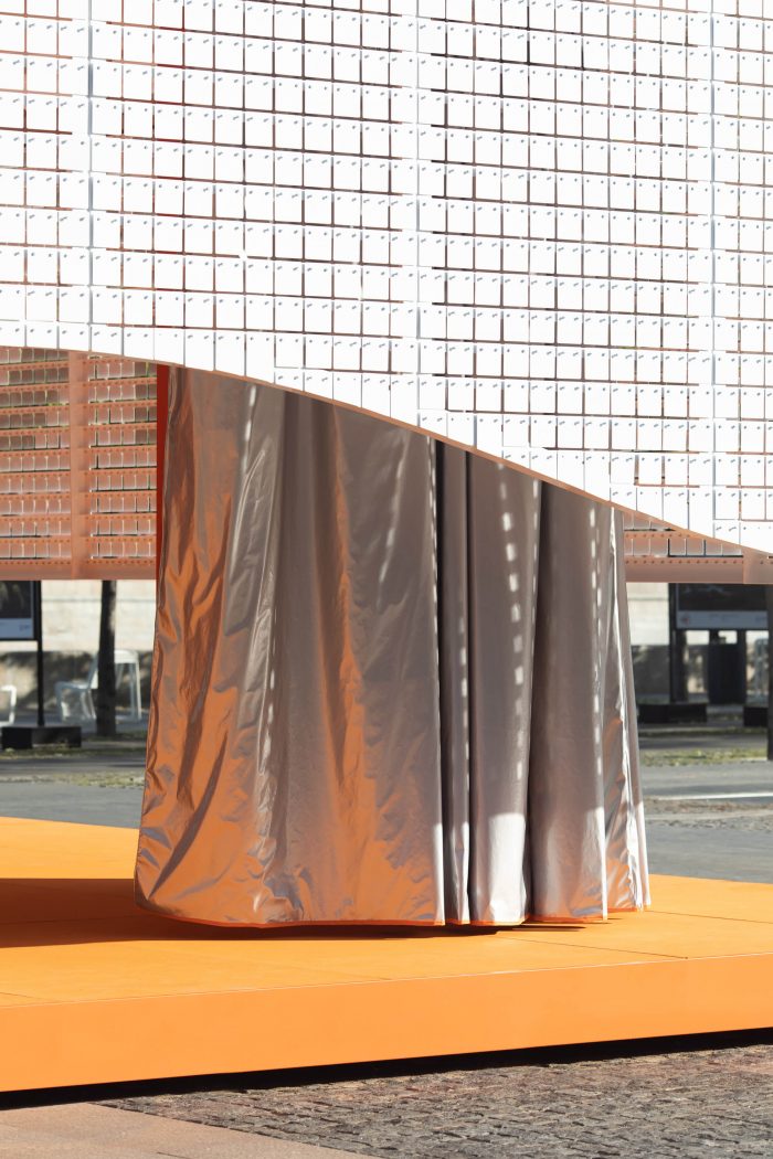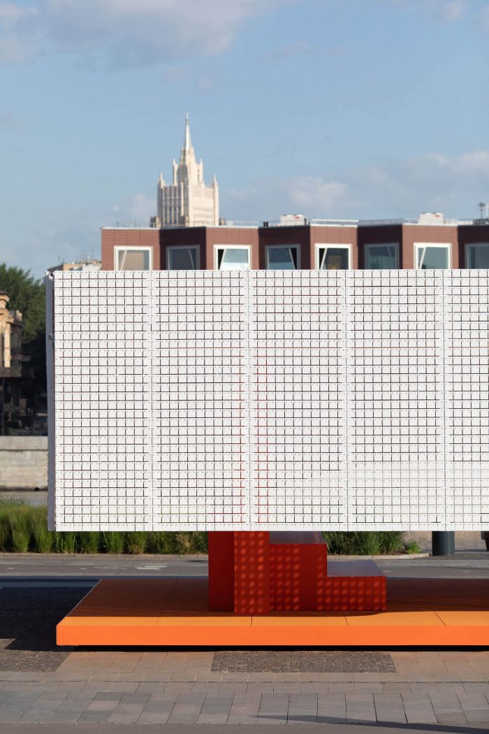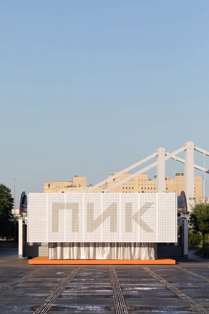 The pavilion has an area of 150 sq. m. and a height of 4.5 m. It has a spectacular kinetic facade, which sets in motion even from a light gust of wind. The architecture of the pavilion is based on the design code and company's identity, the entire interior is covered with orange rubber coating - the corporate color of PIK Group. It was designed as a relocatable construction, which can be easily and quickly mounted and demounted and smoothly fit in at the new location.