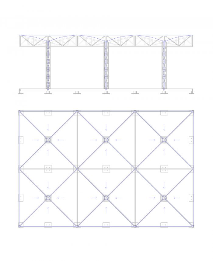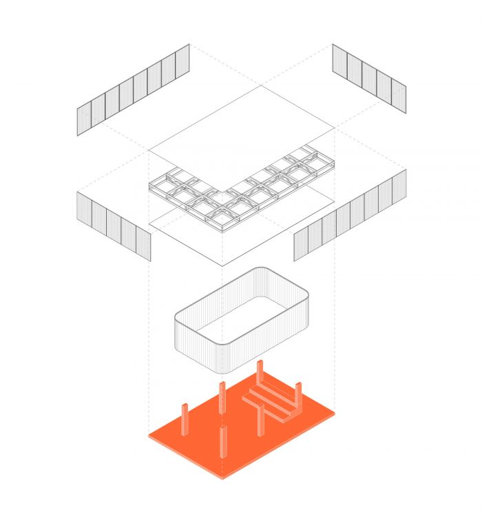 Structural design. The pavilion is a prefabricated structure. The roof structure is supported by 6 bearing columns. Facade panels are mounted on the bearing structure. The floor base is mounted on screw supports for further adjustment to the site relief. The tent roof consists of 6 funnels connected to the drainage system inside the supporting columns for collecting and draining rainfall under the pavilion base.
