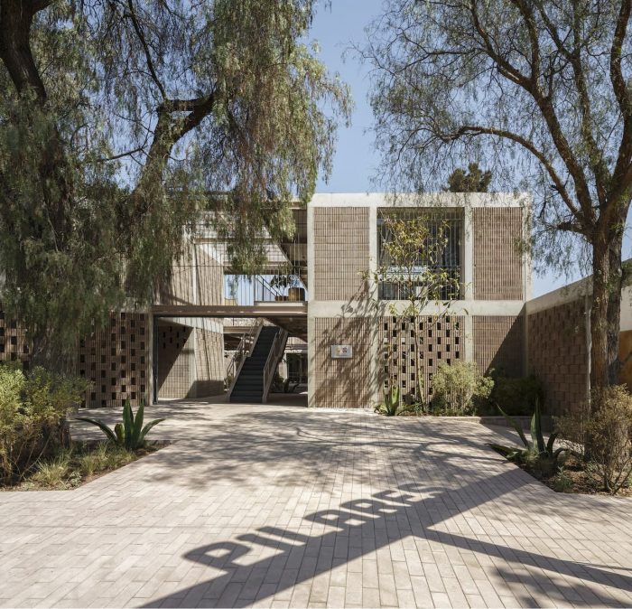 Since this area lacks open spaces, sports facilities, parks, plazas, and gardens, PILARES Presidentes de México was designed as a public, inclusive and multifunctional space that replaces the idea of barriers for meeting platforms. The main entrance is a fundamental part of the project as it connects the community center with the street activity through a green plaza delimited by an open sequence of columns that invite people to enter and inhabit the space. In the attempt to generate abundance from scarcity, only two materials were used: striated blocks and concrete tiles in a reddish tone and steel profiles in the same color palette.
