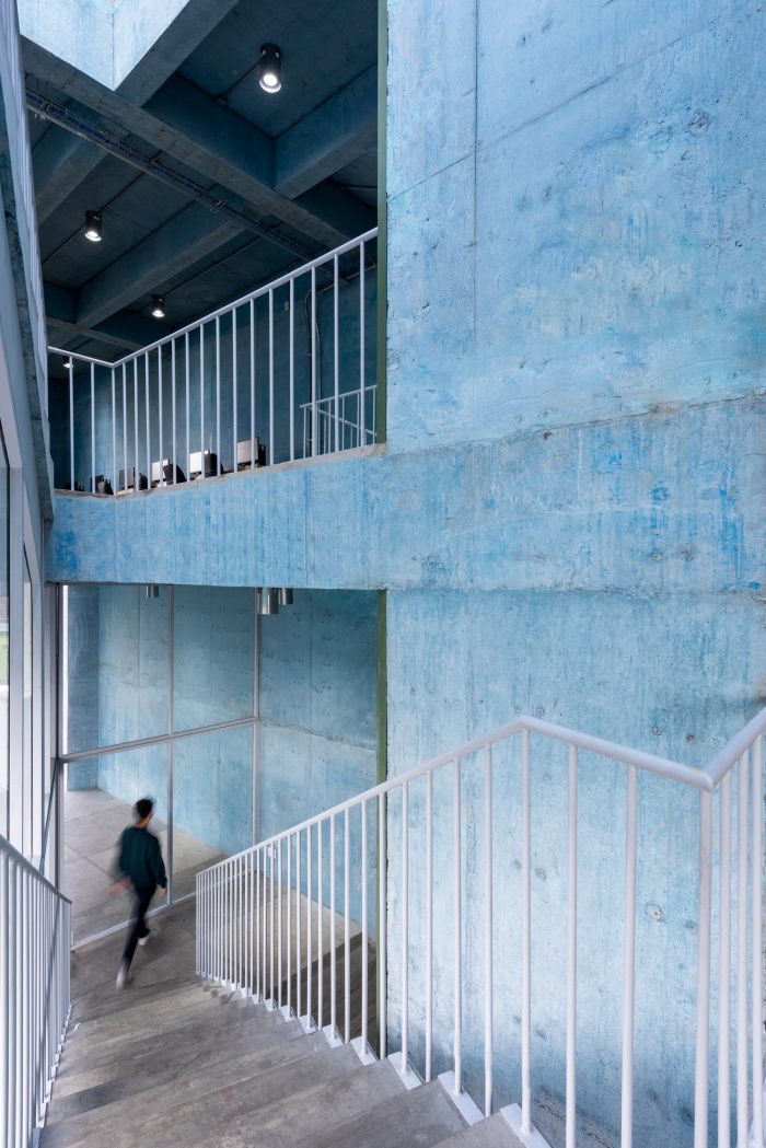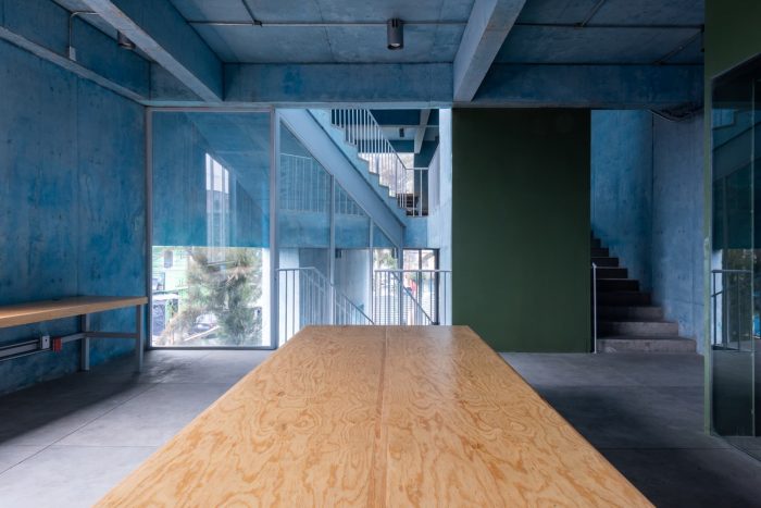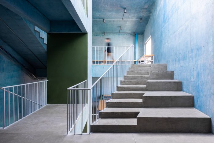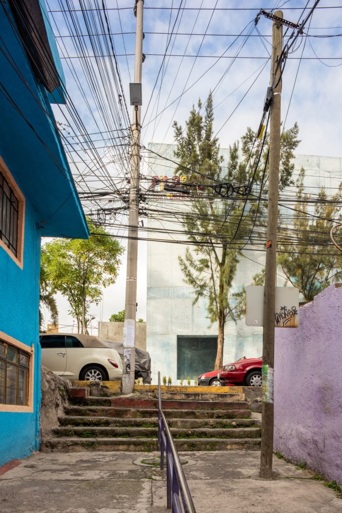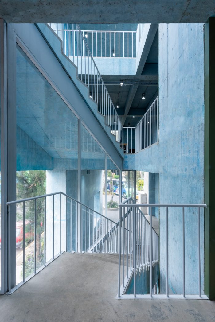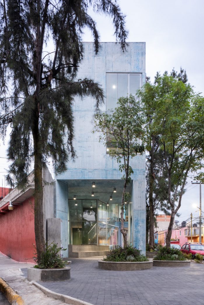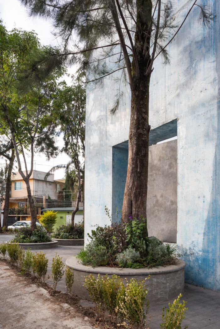 We took inspiration from the neighborhood's beautiful vibrant colors. The use of color in Mexican architecture is an element that has been transformed and reinterpreted in the hands of many artists and architects across generations. The principal material is exposed concrete which features a ridged texture on the exterior and a smooth surface on the interior. It was chosen for its construction, structural efficiencies, and thermal and aesthetic qualities. In appearance, the volume is simple and compact, with a strong character that confirms its presence as a public building, while allowing porosity on the ground. floor and large openings above to render it accessible, inviting, and in close dialogue with the surrounding neighborhood and urban fabric.