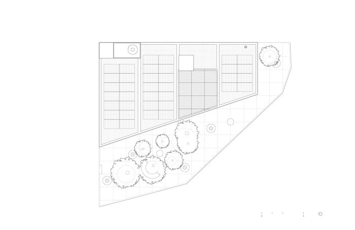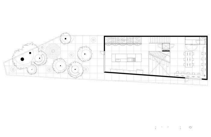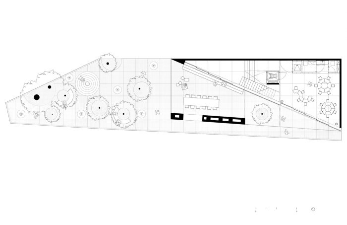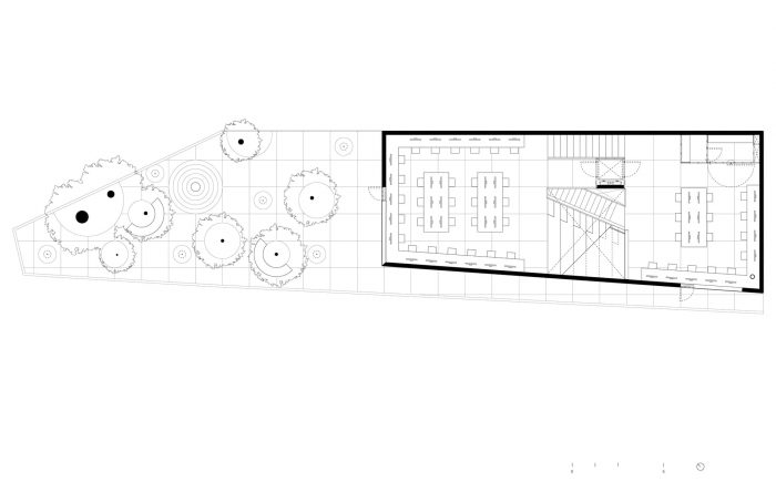 PILARES Lomas de Becerra is located at a dense intersection in a hilly part of Mexico City, surrounded by lively pedestrian streets. The shape of the building is informed by the existing trees on the site and by the creation of a public plaza on the corner. The diagonal opening on the ground floor provides clear and free-flowing pedestrian routes in every direction, inviting users to walk around the plaza and enter the building. The diagonal walls set in the plaza serve to organize the transition between inside and outside. The ground floor is open, and the interior space is marked by a lightweight glass façade that opens outwards, expanding the plaza space towards the street level, making it accessible to pedestrians and to the whole community for use as a place of encounter and at which to enjoy cultural and social activities.