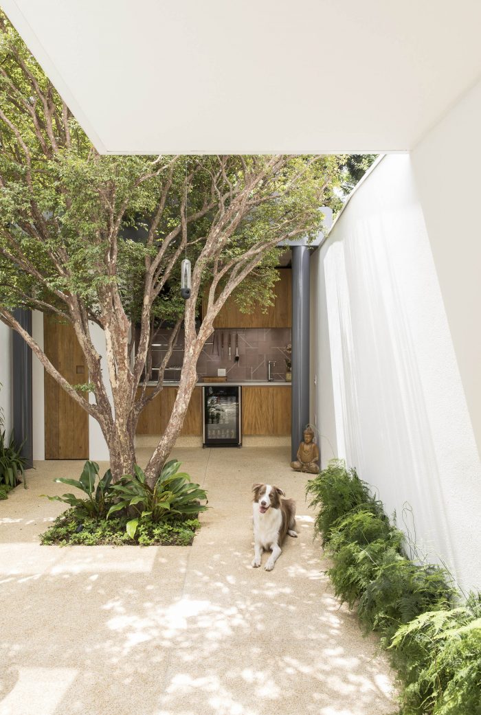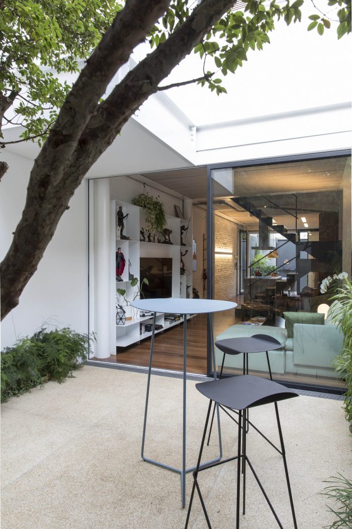 The central garden, between the living room and the barbecue, received an adult jabuticabeira, transplanted in the final phase of the work. In addition to contributing to thermal comfort, the tree shares its fruits with the residents.
