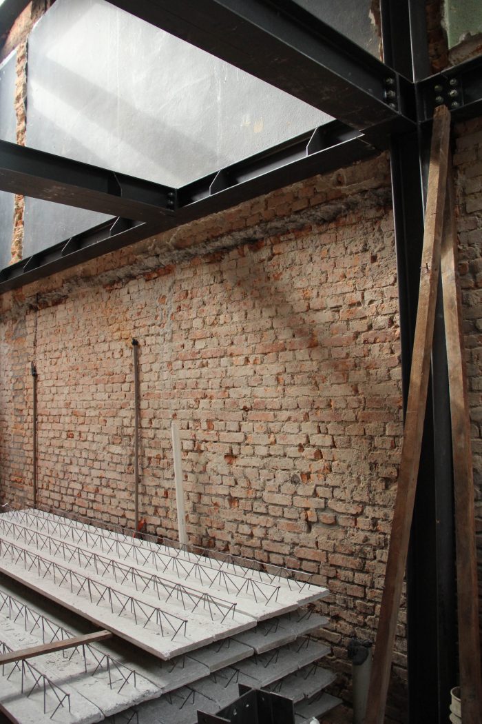 在客厅里,结构变得很明显:圆柱形截面的金属支柱、金属梁、板坯、大量的砖,最后是建筑师设计的金属板架。