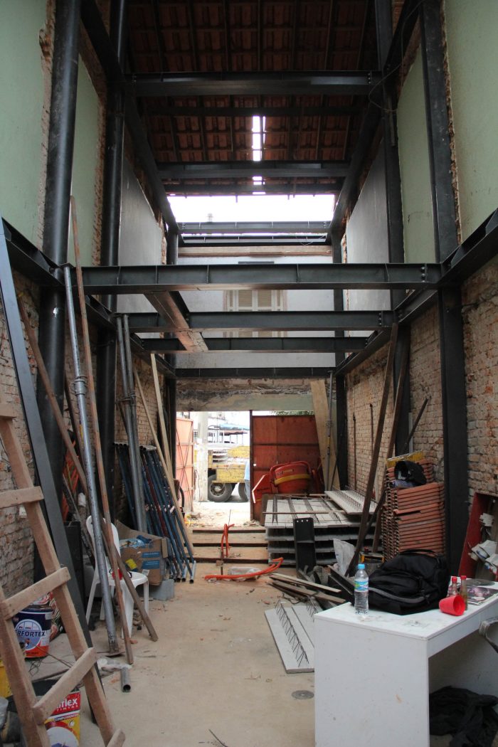 In the living room, the structure becomes apparent: cylindrical section metal pillars, metal beams, panel slabs, massive bricks and finally the metal sheet shelf that was designed by the Architects.
