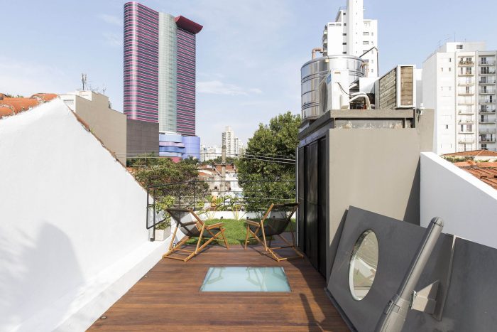 The metal ladder extends to the cover, which is accessed from the automated hatch. The new structure added to the raised floor for the passage of the infrastructure made possible the installation of a lawn with garden and vegetable garden on the same level as the wooden deck. The laundry and the infrastructure equipment are solved in a volume that can be opened or closed by perforated metal doors of the “shrimp type”.