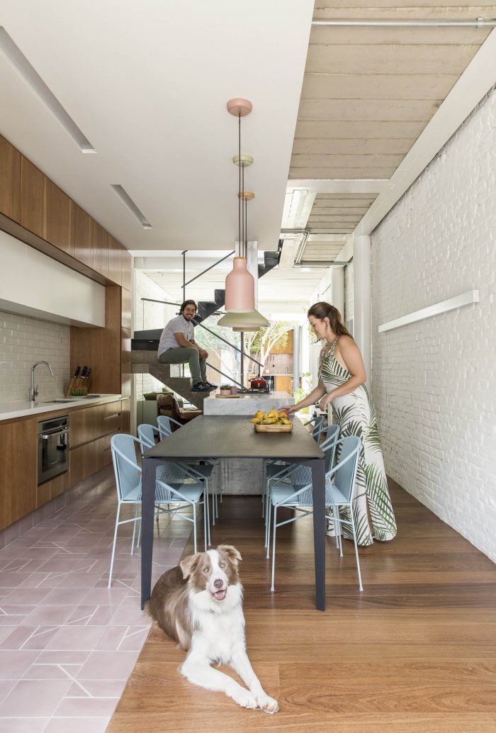 大理石烹饪岛旁边的餐桌,一边是厨房,另一边是去生活区的人的通道。厨房是由建筑师设计的木工家具组成,地板是液压砖和石凳。这些环境加起来有3.60 x 5.15米。