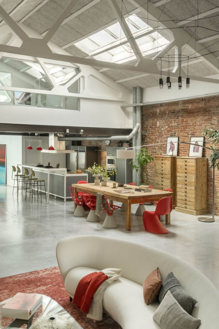 The original industrial style kitchen was preserved, incorporating it into the new design and integrating it with the colour range of the rest of the loft. Stools and the iconic Campari lamps by Ingo Maurer were included, thus giving the red note that is repeated in some spaces. Very special pieces with a lot of character were placed in the dining room, matching the modern style and providing a note of contemporary design. This combination allowed to obtain fluidity, finding the perfect balance between comfort, design and warmth.