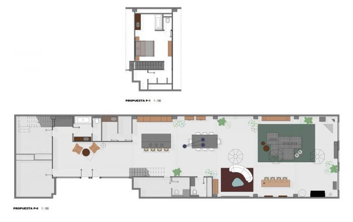 The projection zone was created with a double function; on the one hand, it will serve for presentations and reinforcement in the events and, on the other hand, it will be used in a more informal and private way for the screening of films. The curved sofa allows visibility of both the hidden projector on the transverse wall and the television on the sidewall, hence breaking straight lines of composing the space. In the centre of the loft, the modular island sofa is marked as a channelling axis of the living room, very functional and with the possibility of changing position according to varying needs. The suite focuses on the second level of the house, overlooking the rest of the space and includes pieces that add practicality while aiming to create a more cosy and intimate area.