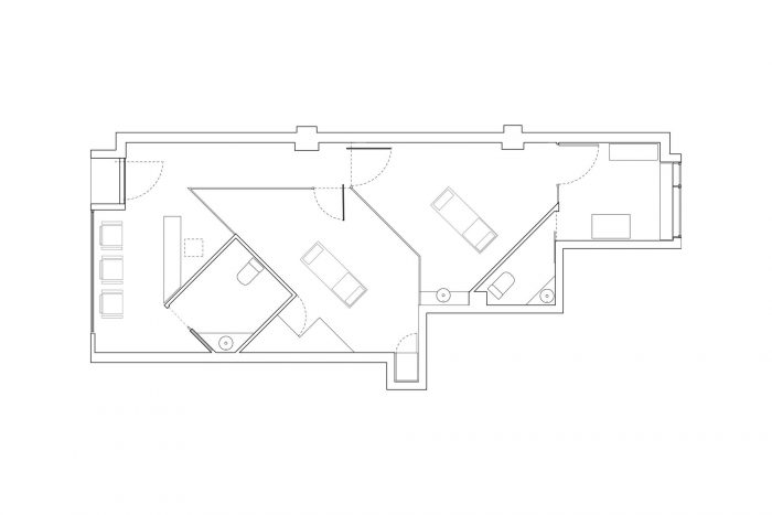 The rooms are organized with distribution axes turned 45 degrees in plan, which articulate the rooms more lightly and approach the accesses to the main entrance.
