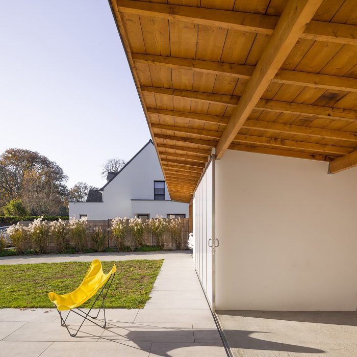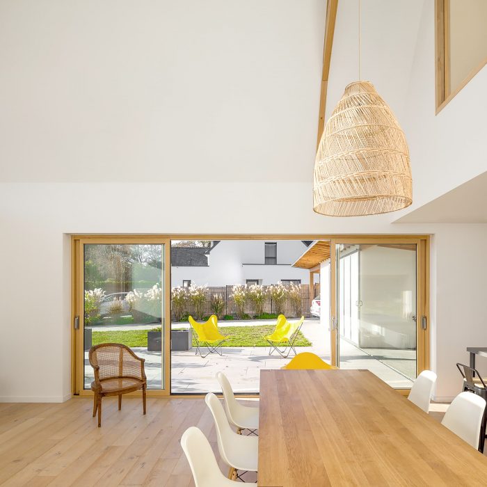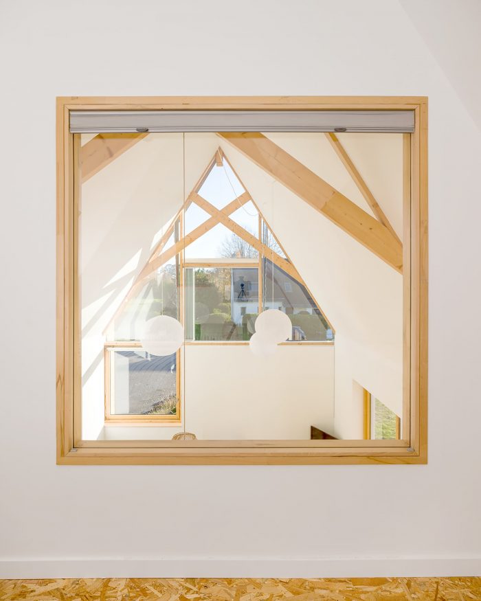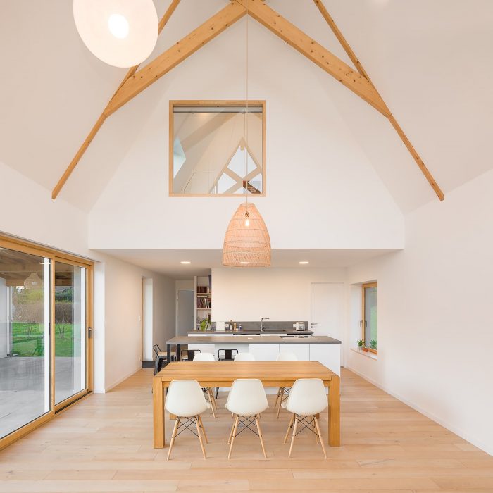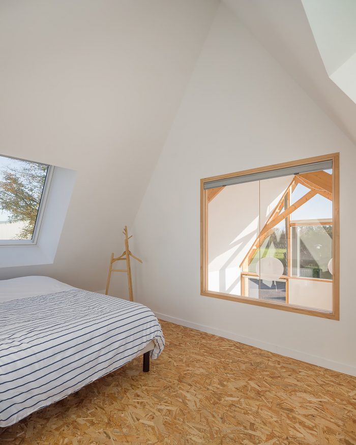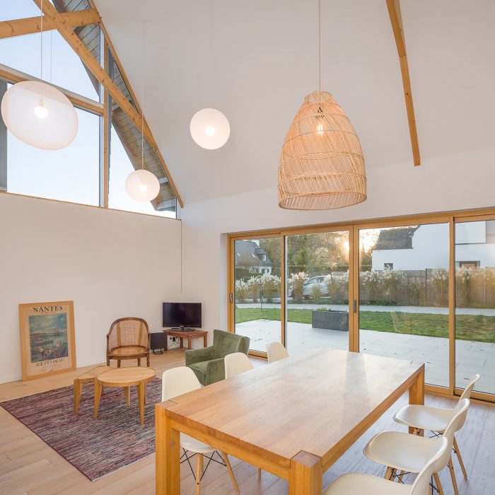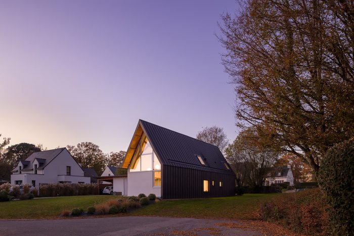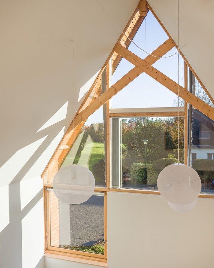 The house is made of masonry plastered in white like the neighbor houses. Slate is no longer produced locally, and therefore it no longer makes sense. It is replaced by aluminum in a dark color like slate. The roof and the timber frame make up the traditional gable roof. However, the slope of the roof, usually 45°, is increased to 60° to refine the silhouette of the house. To the North-West and North-East, the facades are less open but offer a view toward beautiful trees. To the South-East and South-West, the house is generously opened creating a strong link between the interior and the exterior.