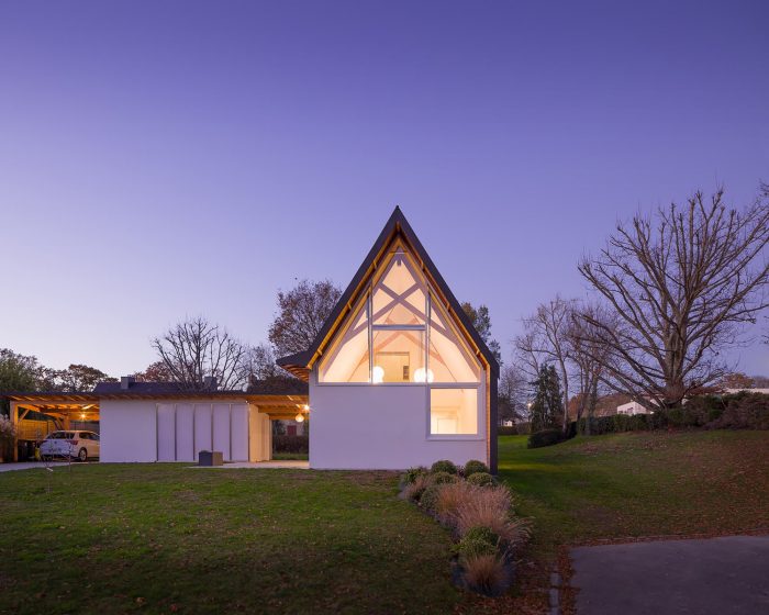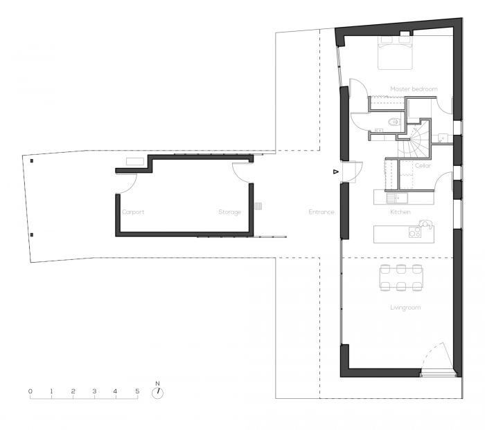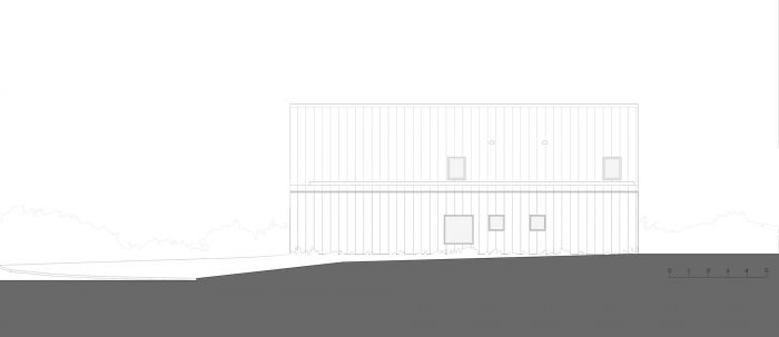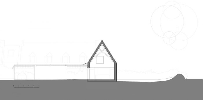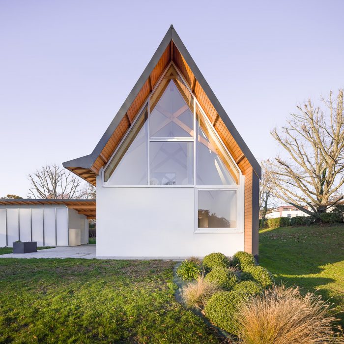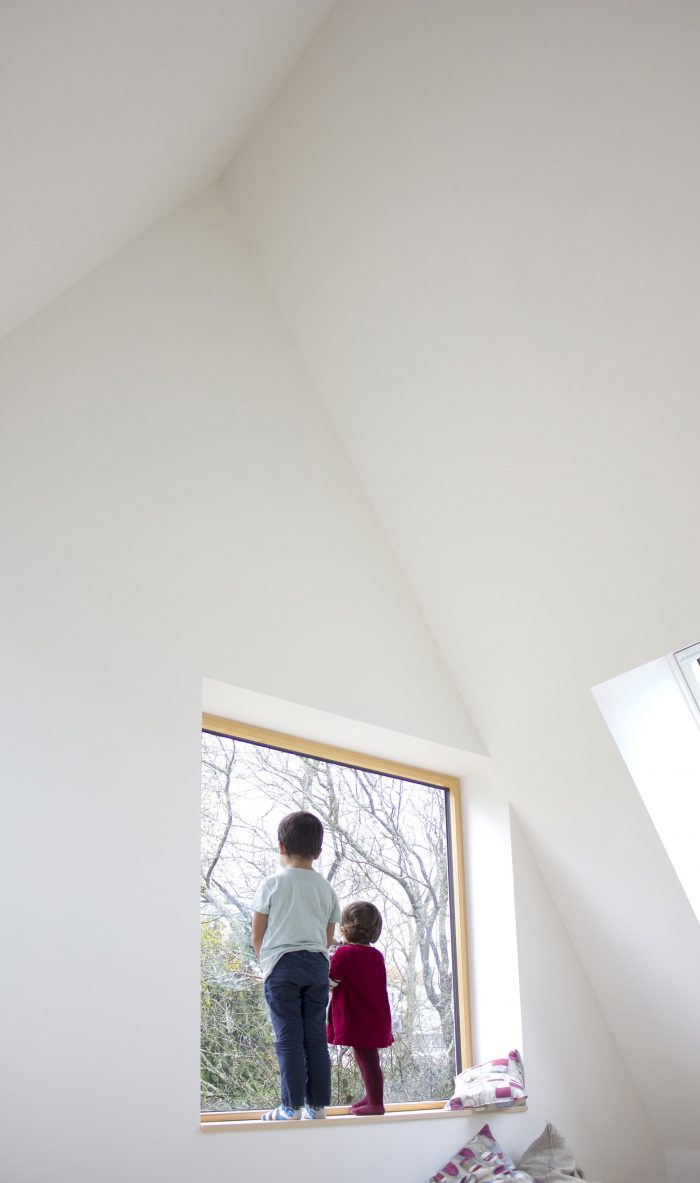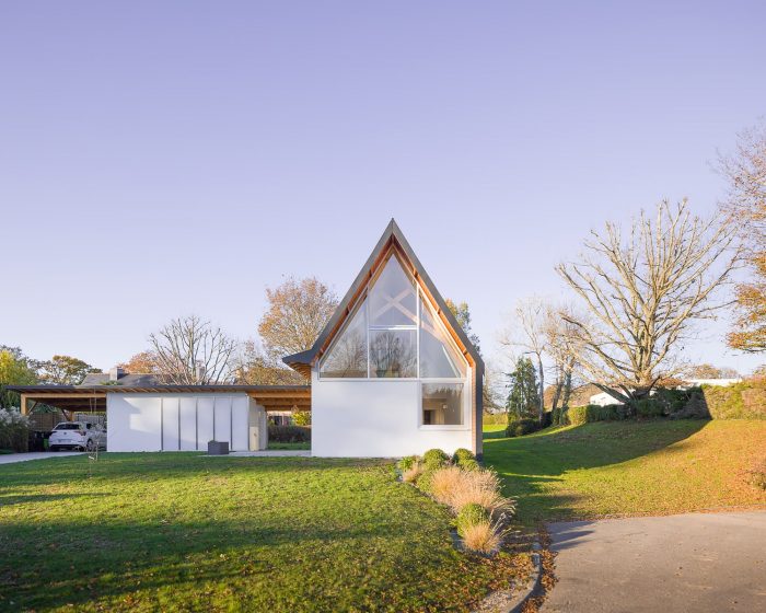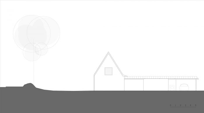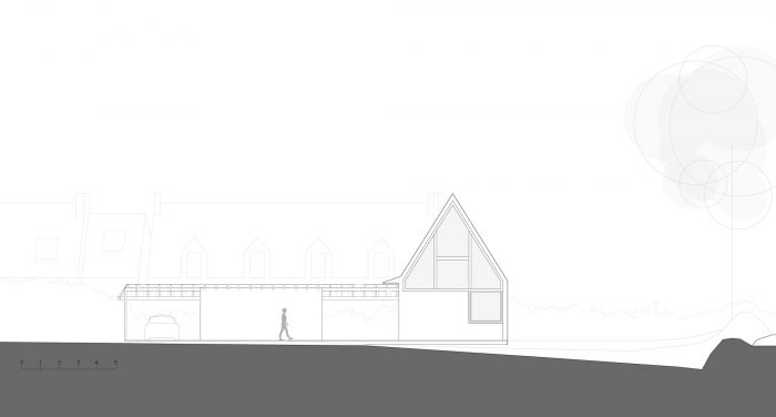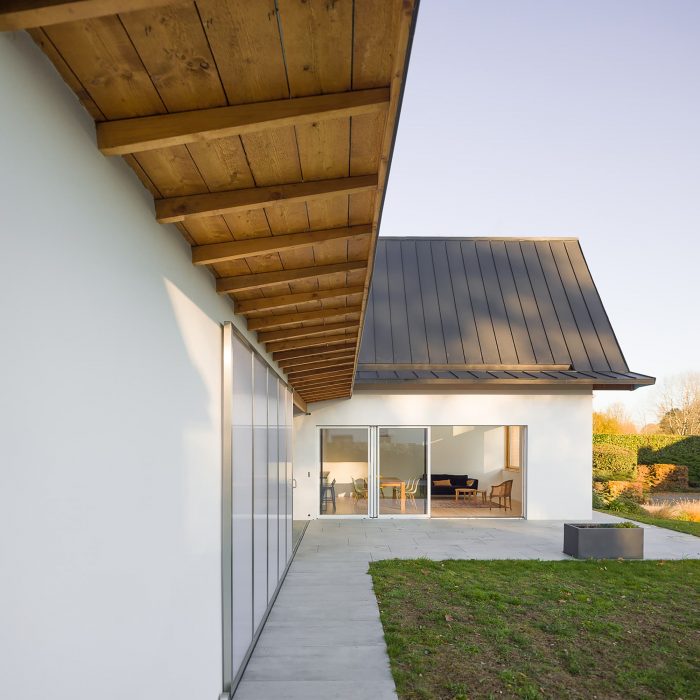 The house is made of masonry plastered in white like the neighbor houses. Slate is no longer produced locally, and therefore it no longer makes sense. It is replaced by aluminum in a dark color like slate. The roof and the timber frame make up the traditional gable roof. However, the slope of the roof, usually 45°, is increased to 60° to refine the silhouette of the house. To the North-West and North-East, the facades are less open but offer a view toward beautiful trees. To the South-East and South-West, the house is generously opened creating a strong link between the interior and the exterior.