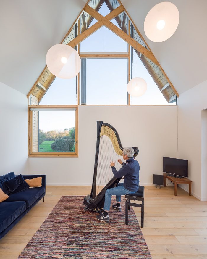 Natural light enters generously into the house whose double-height living room offers a spectacular volume to the client who likes to play the harp. Upstairs, the bedrooms benefit from an atypical volume in the shape of an Indian teepee due to the steep slope of the roof. One has a viewpoint in a tree, like a cabin, and the other has a bird's eye view of the double-height living room. Throughout the house, light and space are designed to create a peaceful and generous atmosphere. The walls and ceilings are white, amplifying the light. The wooden windows and floor warm and soften the light to produce a cozy ambiance.
