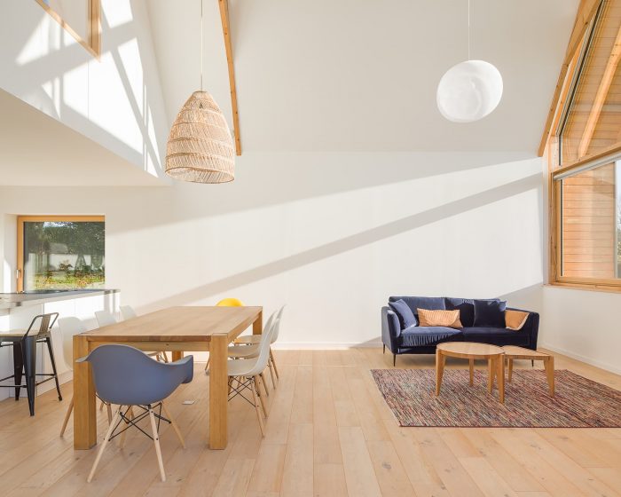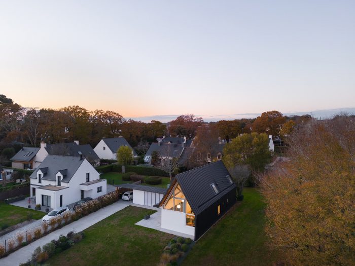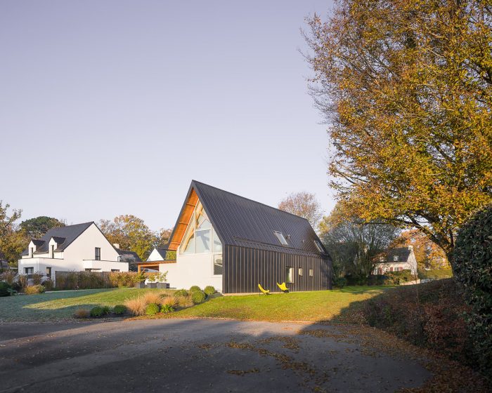 The POG house is located in Arradon, Brittany, France. Brittany is a region with a strong identity because of its language, its gastronomy, its link with the Atlantic Ocean, and its architecture. The traditional architecture, well preserved, is made up of granite houses with small openings protecting from storms and slate roofs, a stone originally produced in the neighboring town of Angers. Nowadays, mass construction, constituting 90% of house construction, is made of concrete blocks coated in white and gable roofs made of stone slate imported from Spain. In addition to these classic characteristics, builders generally add a parallelepipedal volume, imitating the modern architecture of the 1930s by Le Corbusier.