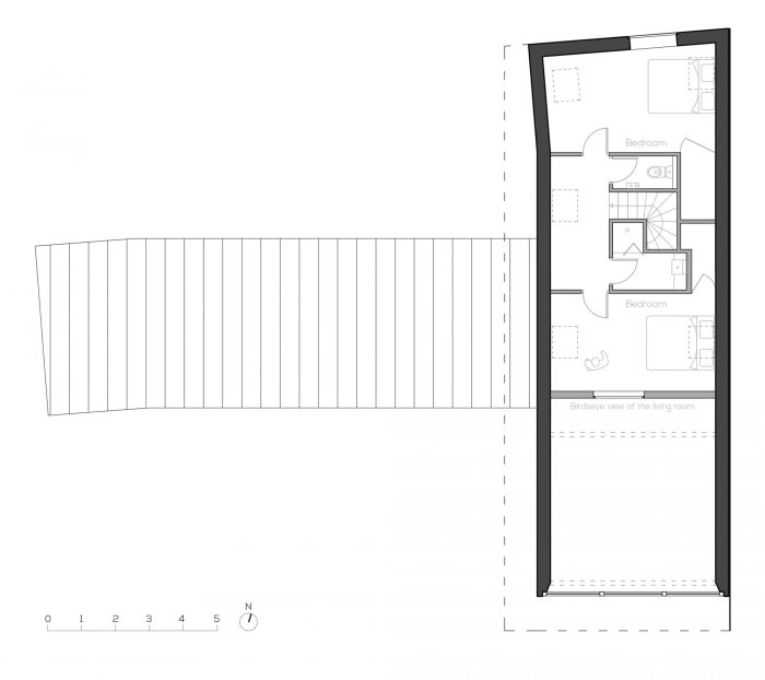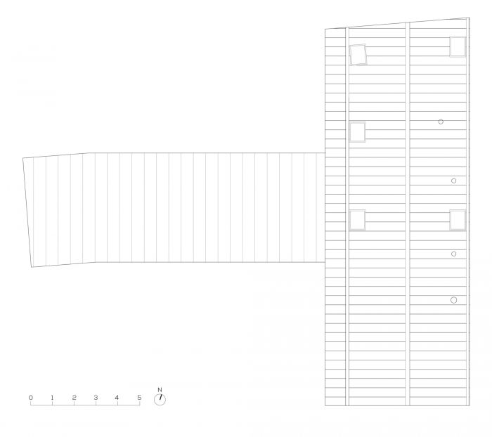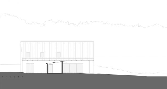 房子是由砖石砌成的,像邻居的房子一样用白色抹灰。当地不再生产石板,因此它不再有意义。它被像石板一样的深色铝所取代。屋顶和木质框架构成了传统的檐形屋顶。然而,屋顶的坡度,通常是45°,被增加到60°,以细化房屋的轮廓。西北和东北方向的外墙不太开放,但可以看到美丽的树木。在东南和西南方向,房子被大大地打开,在内部和外部之间创造了一个强有力的联系。