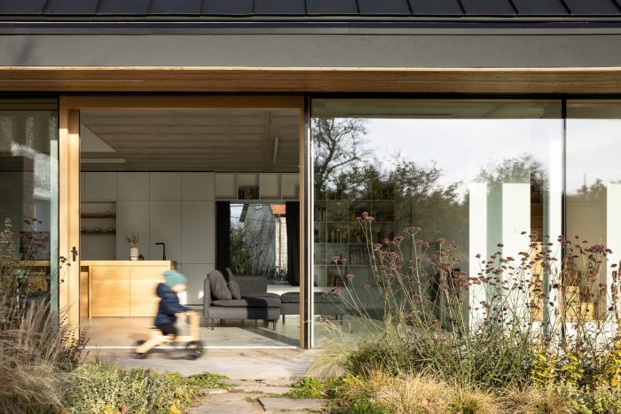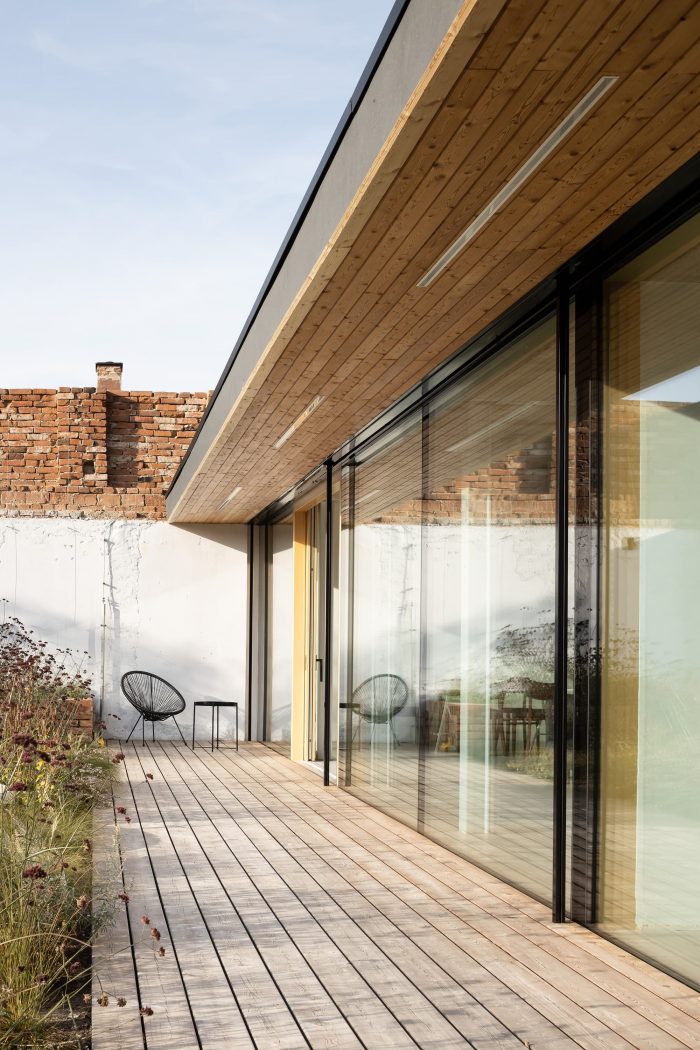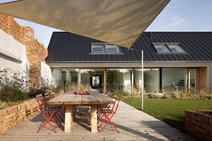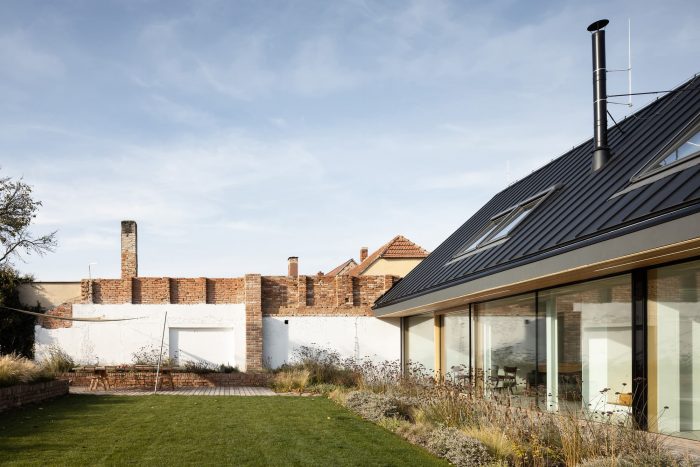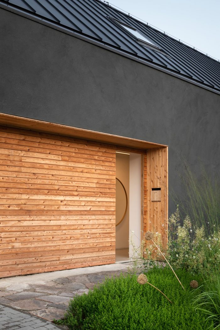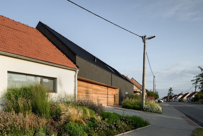 On the facade, there is black plaster, and on the roof, there is black corrugated roofing. Recesses from the main volume are solved in wooden paneling precisely because they are located on the border of the exterior and interior. The color black was not chosen randomly. The symbolism of the "hole" is hidden in it. The new building fills the hole left by the original house, which has not been inhabited for several years. While the house looks closed off to the street, it opens up fully to the garden through a large glass area.