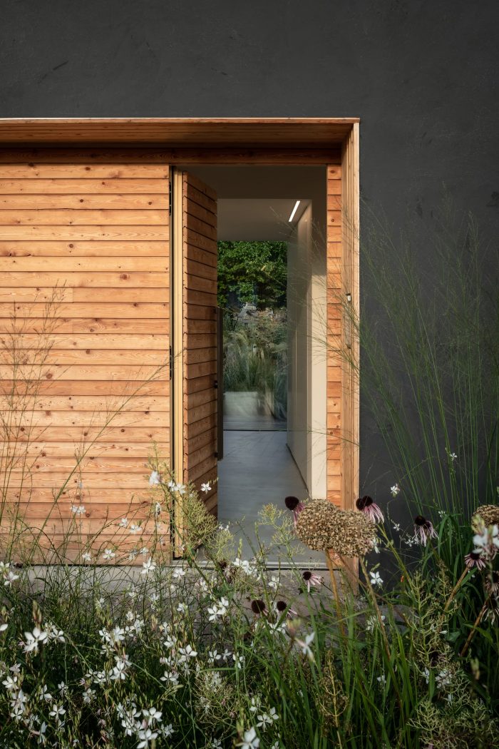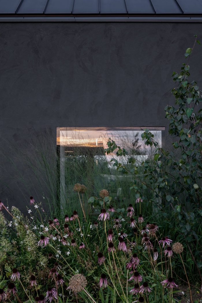 在外墙上,有黑色的石膏,而在屋顶上,有黑色的波纹屋顶。主体部分的凹槽用木板解决,正是因为它们位于外部和内部的边界上。黑色的颜色不是随意选择的。洞 "的象征意义就隐藏在其中。新建筑填补了原来的房子留下的洞,它已经几年没有人居住了。虽然房子看起来对街道是封闭的,但它通过一个大玻璃区完全向花园开放。