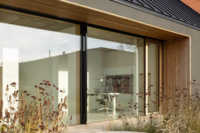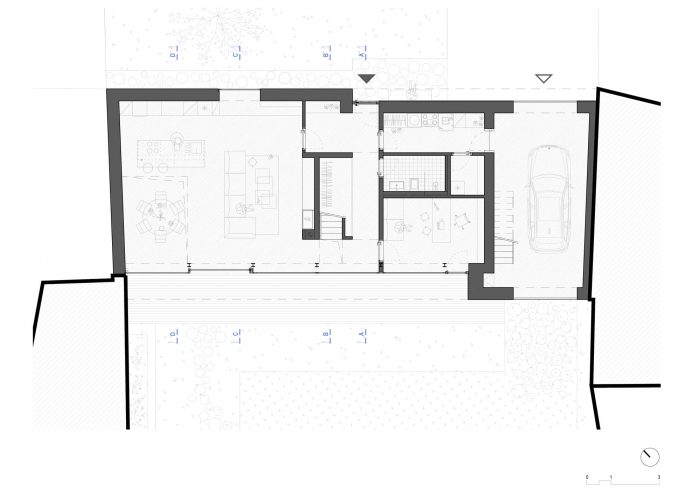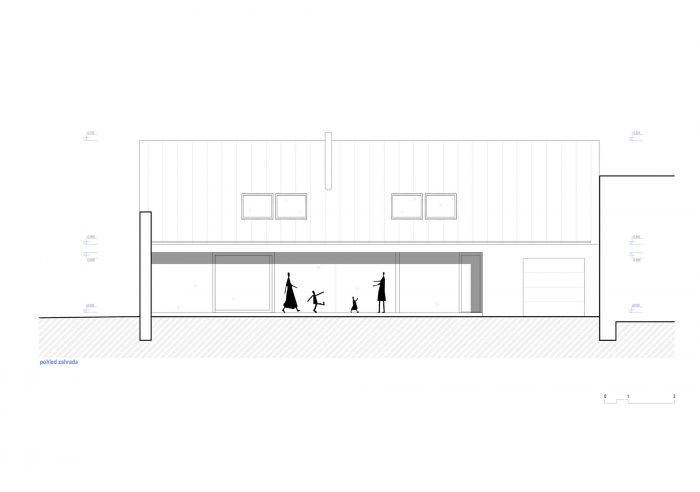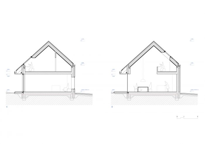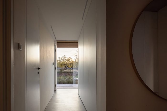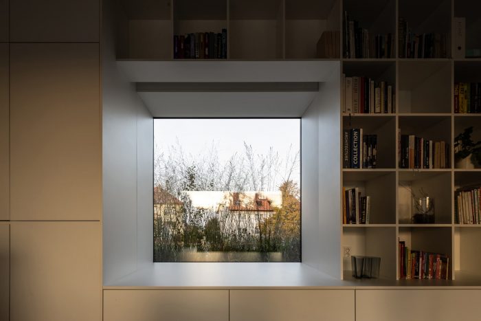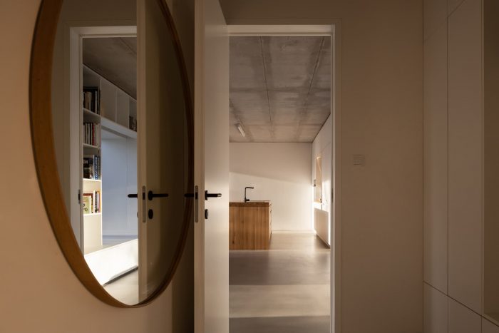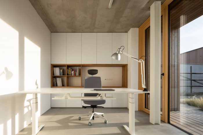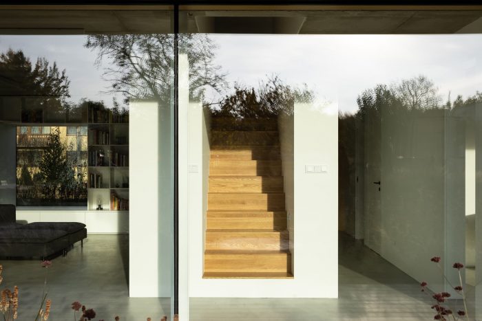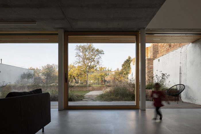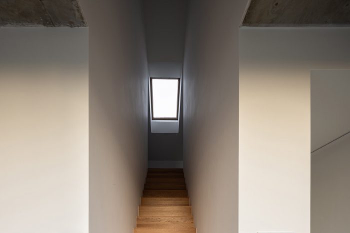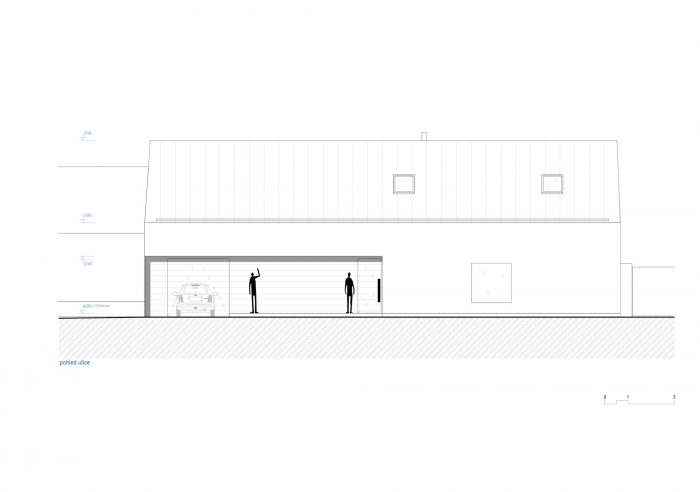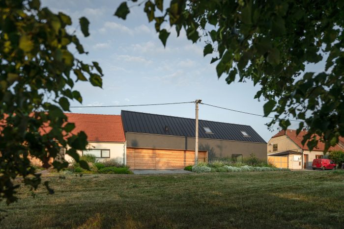 The color and material of the interior are based on the material texture and the exposure of the basic structure of the building. The entire space is dominated by cement screed floors, exposed concrete on the ceiling, and white painting on the walls. The work with built-in furniture also follows this color, where the white color is again predominant, complemented by distinctive solid oak elements. In terms of layout, the building again responds to the traditional principles of local development. Operationally, it is divided into two basic units – a drive-through garage with an attic and a part intended for living.