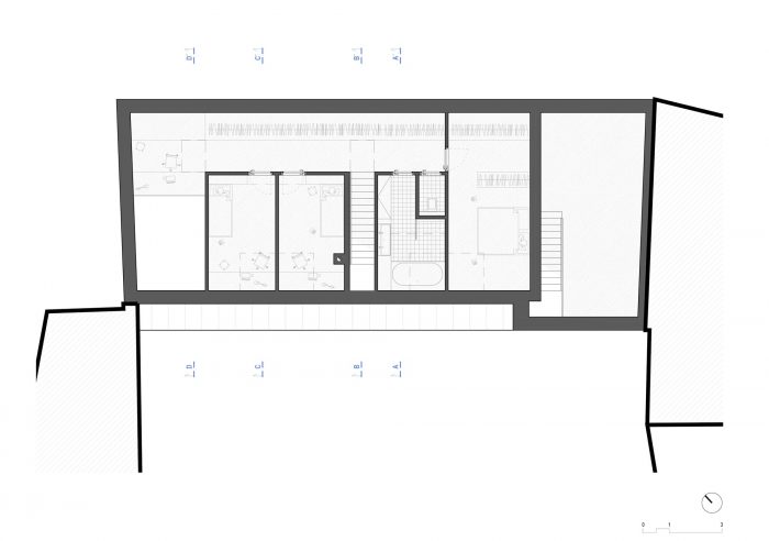 室内的颜色和材料是基于材料的纹理和建筑基本结构的暴露。整个空间以水泥砂浆地板为主,天花板上有暴露的混凝土,墙壁上有白色绘画。内置家具的工作也遵循这一颜色,白色再次成为主流,并辅以独特的实心橡木元素。在布局方面,该建筑再次响应了当地发展的传统原则。在操作上,它被分为两个基本单元--一个带阁楼的车房和一个用于生活的部分。