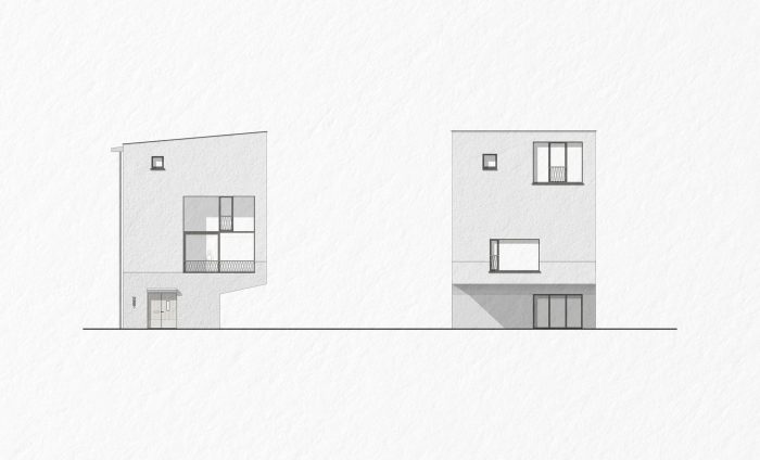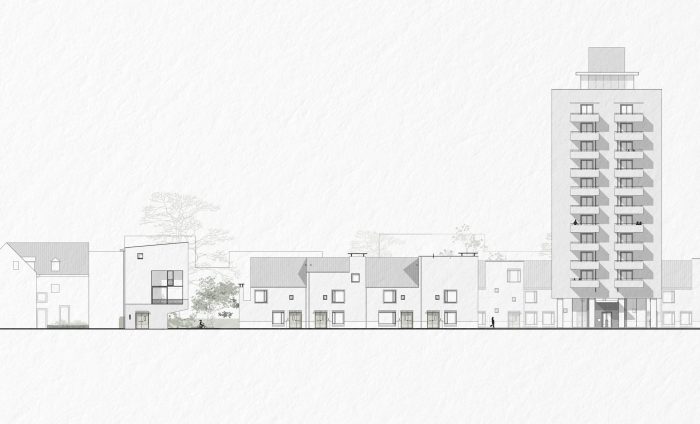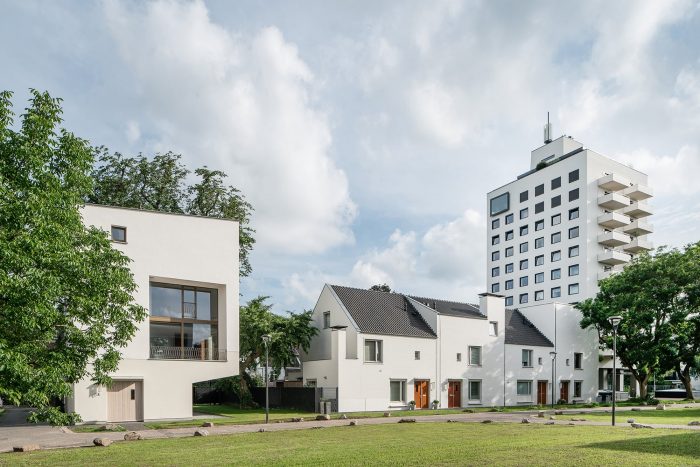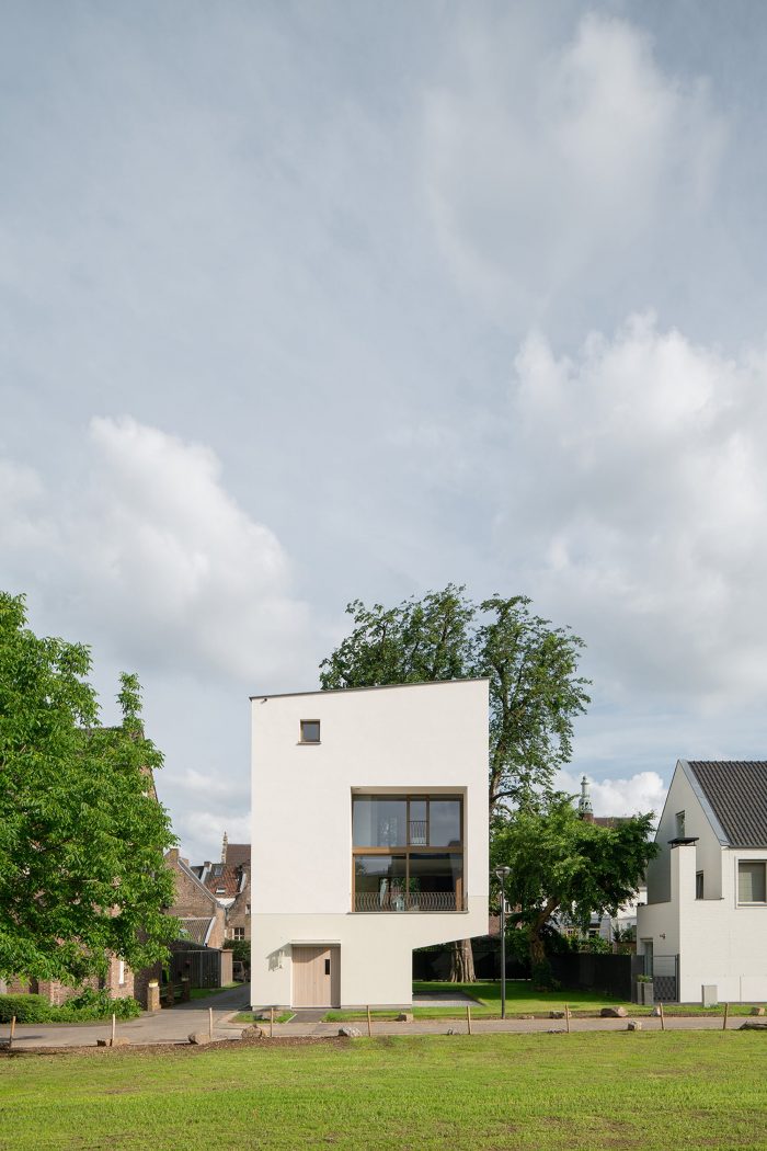房屋体量是由一些城市规划限制和地块上的树的存在形成的。作为最后的作品,房屋被作为一个雕塑对象插入到这一排。而这样一来,这些体量与相邻的现代主义纪念碑式的Polvertoren形成了对立。在色调、质地和规模上,它们是家庭在两个事件中的停留。属于一个渐进式城市的个人姿态。