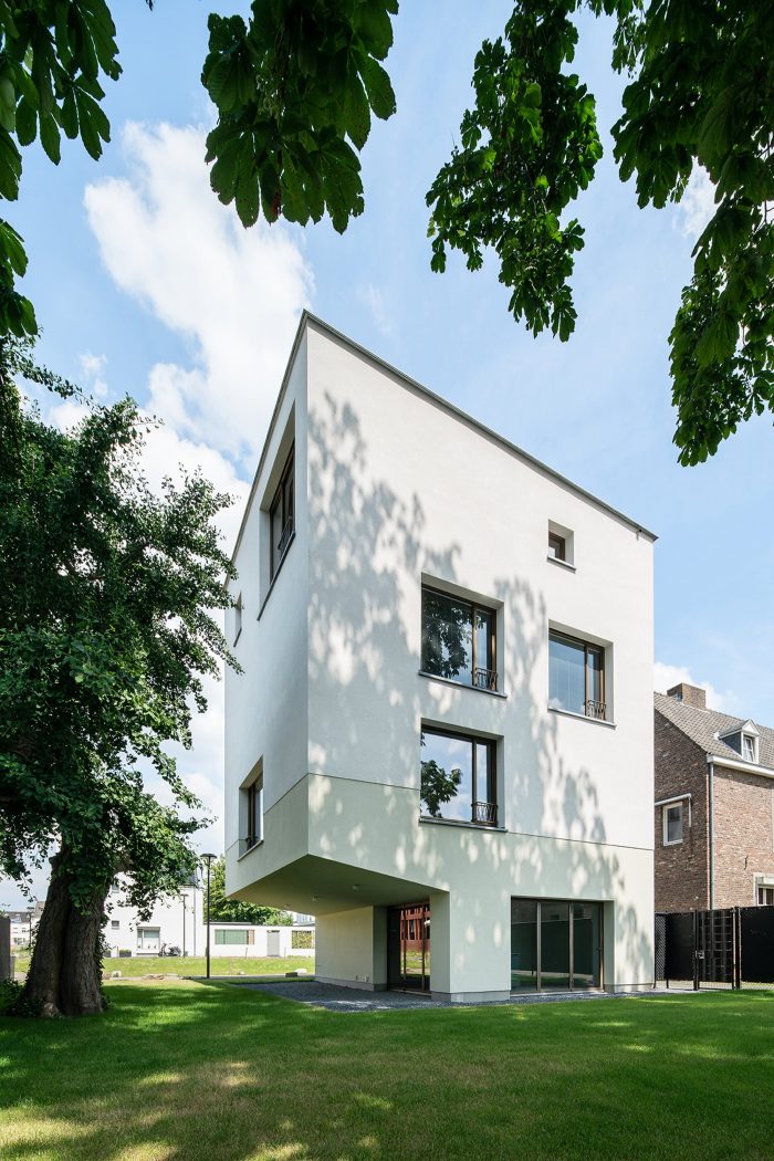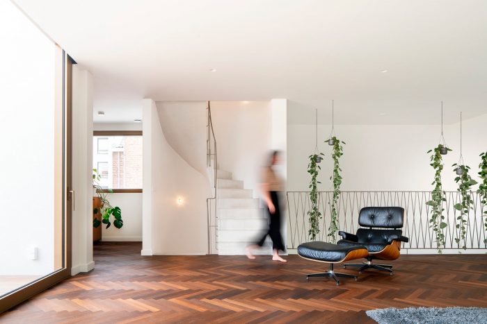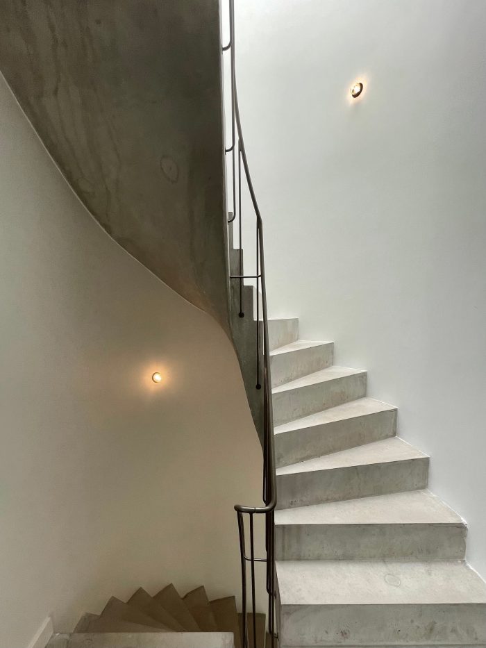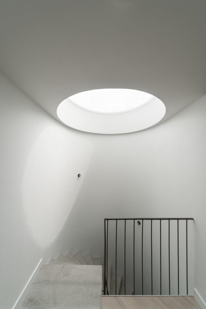 The ground floor is connected to the first floor by a large void and that floor is connected to the second floor by the loggia. The third floor through a large skylight with the sky and looks back at the Polvertoren. The concrete spiral staircase with an open center circle through the volume is a connecting vertical core throughout the house.