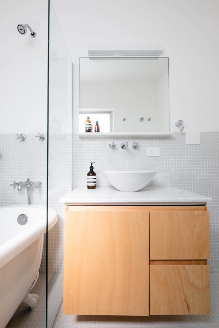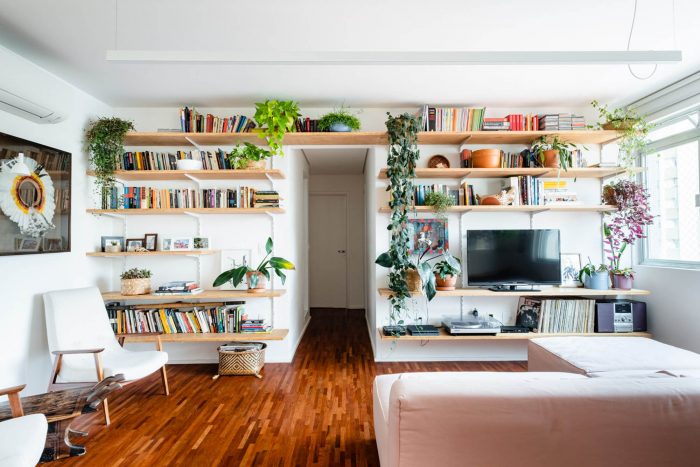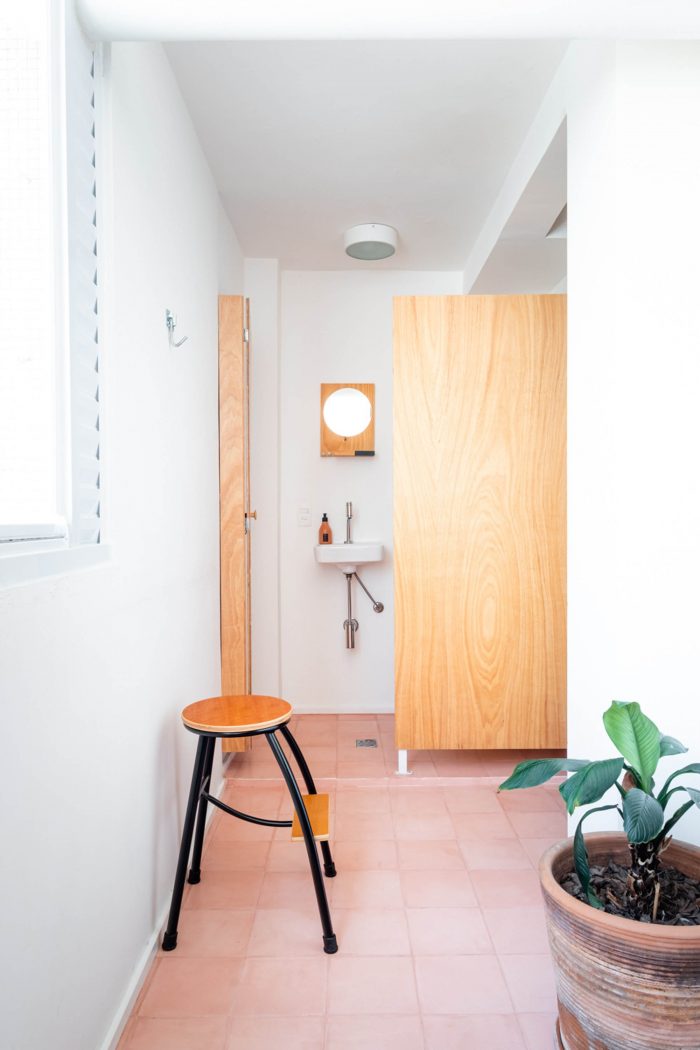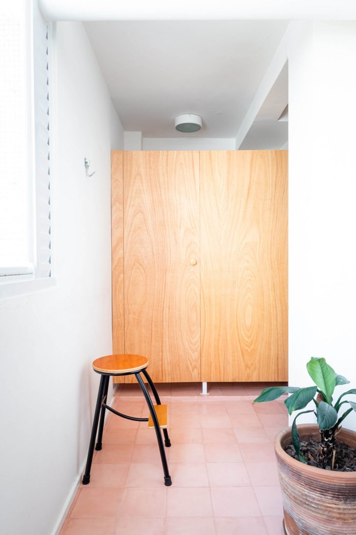 细木工板采用裸露的船用胶合板和白色层压板。对于客厅,由于书和物品的数量,我们用架子来支撑书架。家具很朴素,与公寓其他地方的颜色和质地一致。