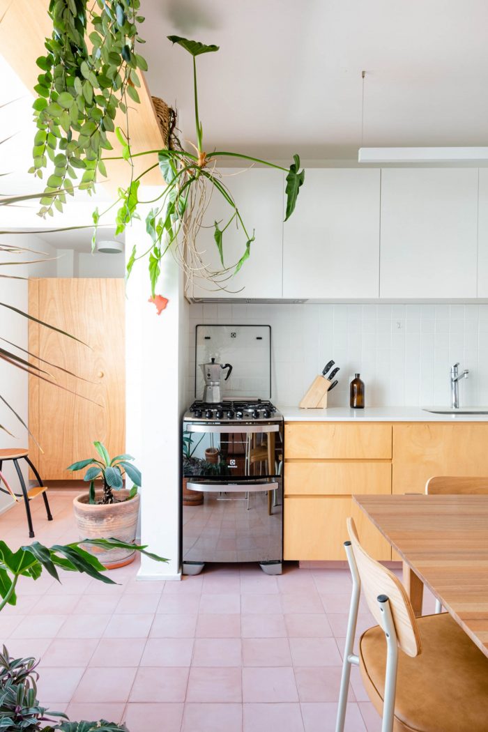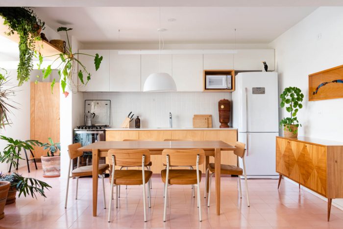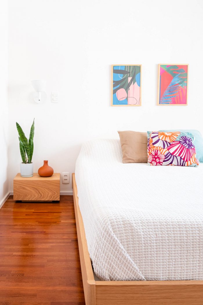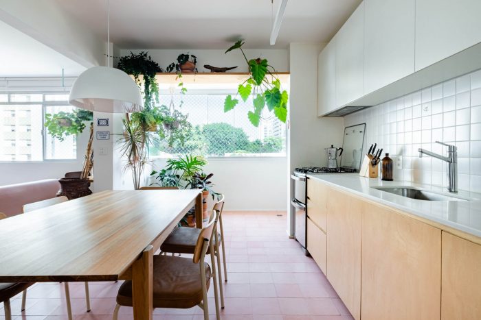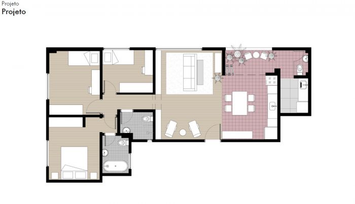 The chosen finishings are simple and elegant. Wood floor and white paint in the living rooms and bedrooms, pink hydraulic tile in the kitchen, veranda and toilet, tiles in 10x10 cm format in the kitchen and service area, and ceramic tiles on the floors and walls of the bathrooms.