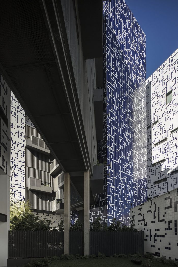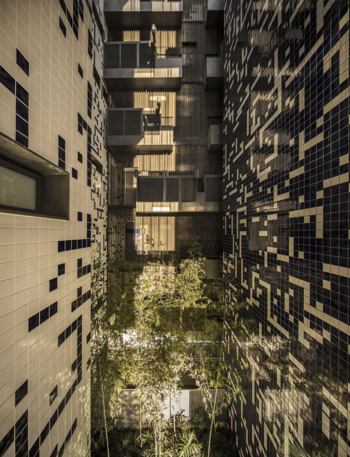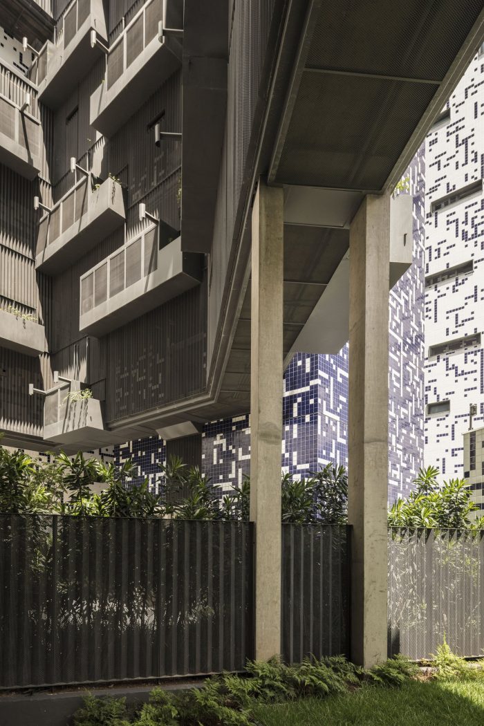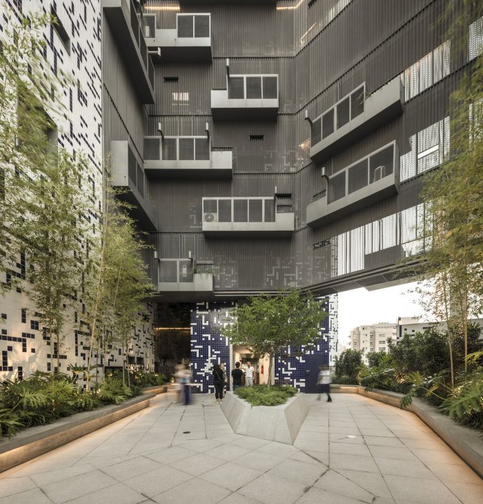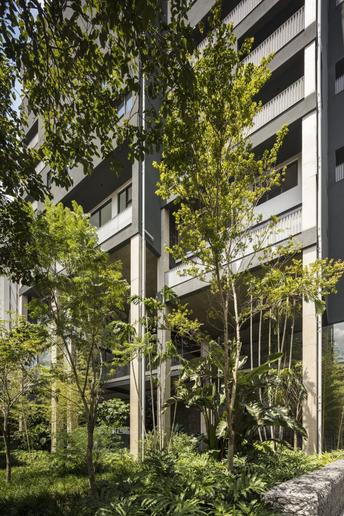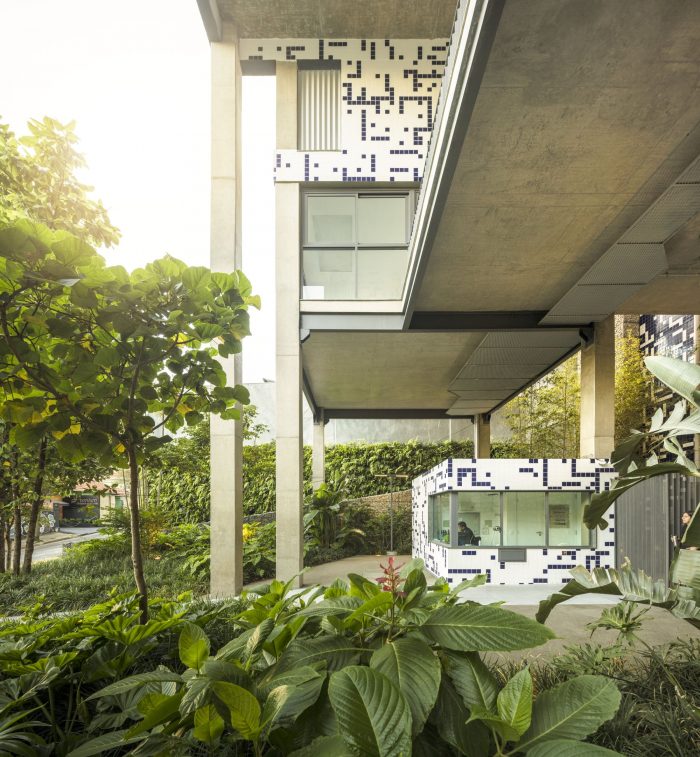 The vegetation plays a central role in this project, whether in the plats attached to the walkways, as in the ground-floor, where the green density creates an atmosphere of urban forest under the building. As if the building spring up from the jungle, opening like a square to the city.