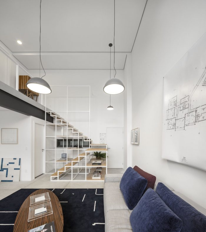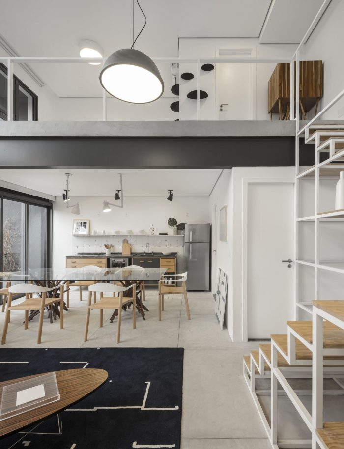 The collective memory of Vila Madalena takes place in the choice of coatings, which the predominance of projected concrete - rough and rustic material, almost primitive, in graphite color - is a reference to the very used coating for the old constructions of the district.