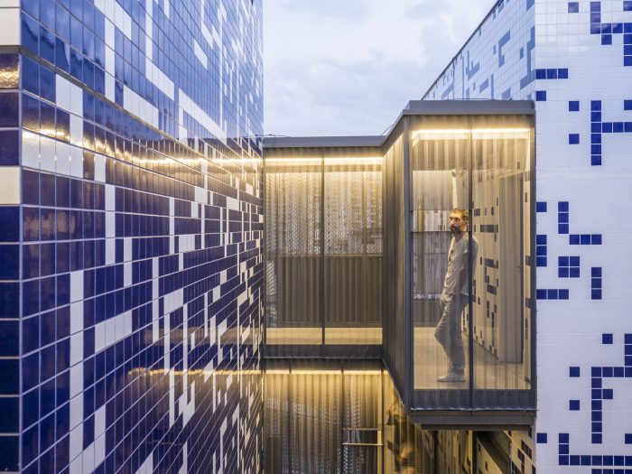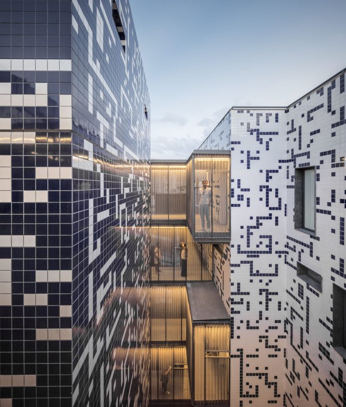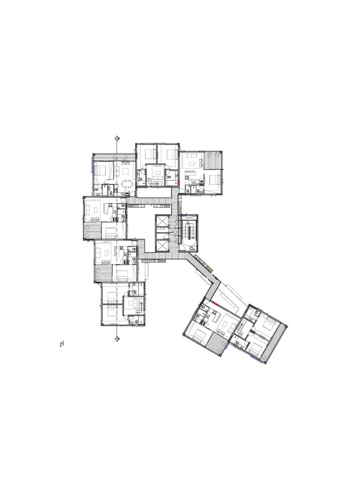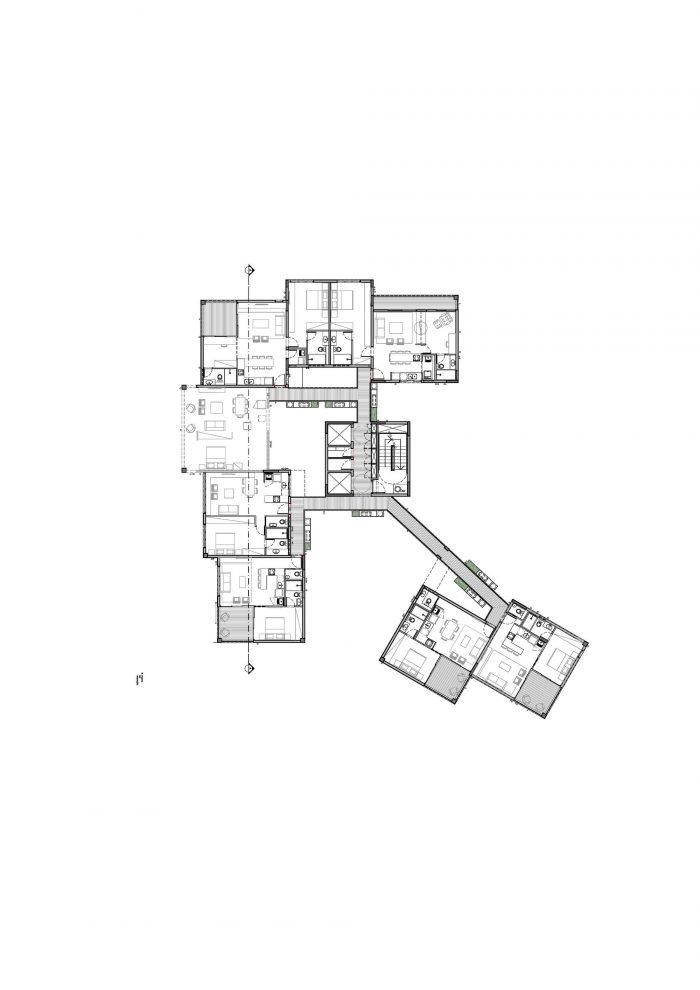 为此,建筑师决定将建筑群分成八个随机分布的区块,每个区块都有独立的通道,其位置保证了最佳的视野,优化了通风和自然采光。第九个区块容纳了电梯、竖井和楼梯,它集中了金属天桥的出口:居民之间流通和社交的地方。
