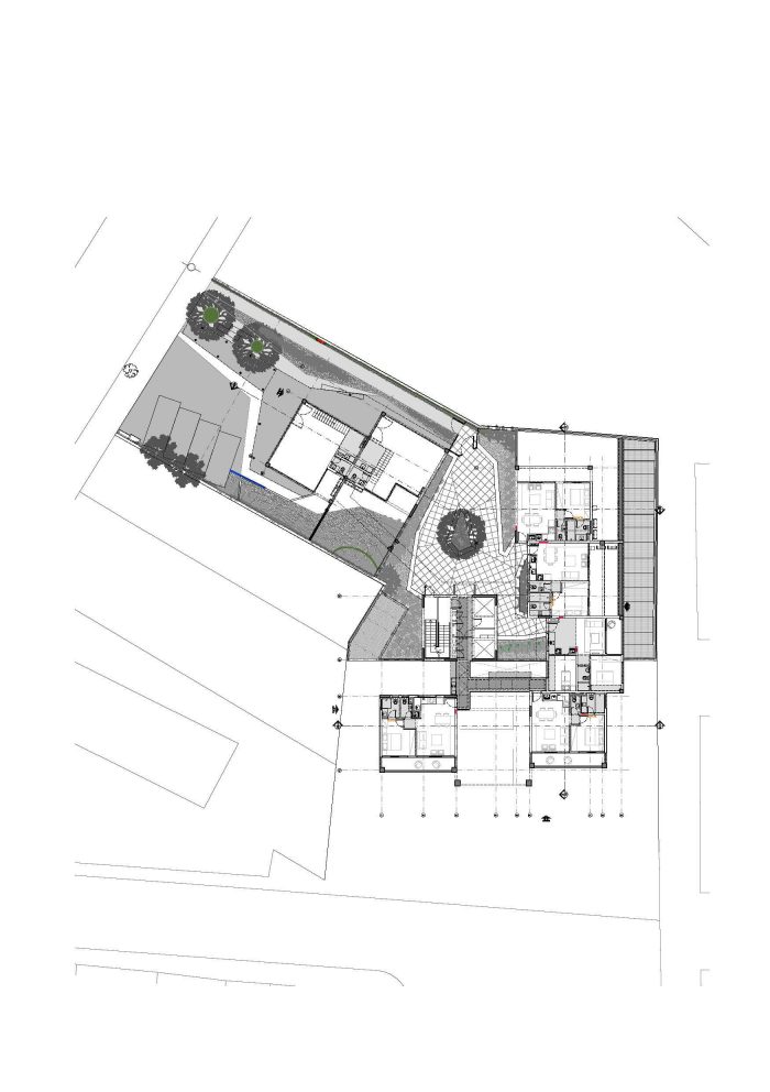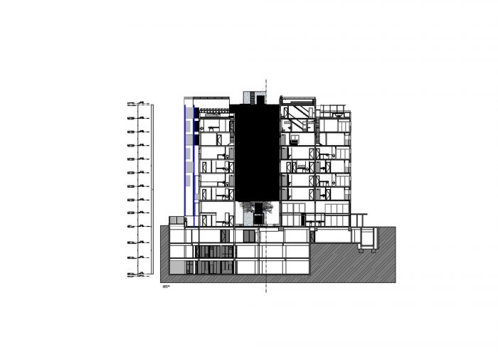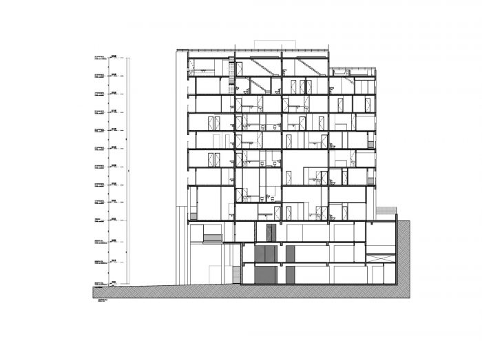 The result is a configuration of apartments allowing for privacy equal to independent houses. With generous terraces and a wide ceiling-height, the units varies from studio to triplex and can have different layouts. The shared area in the upper floors and particulary the walkways, are bathed in sunlight and ventilated by the wind.