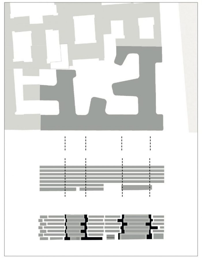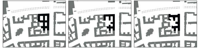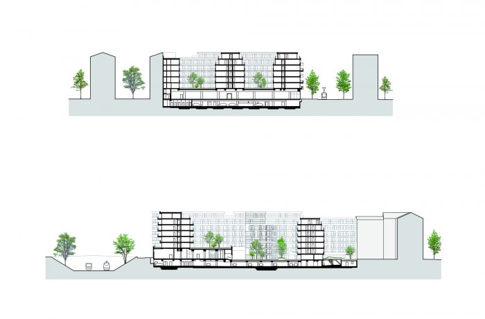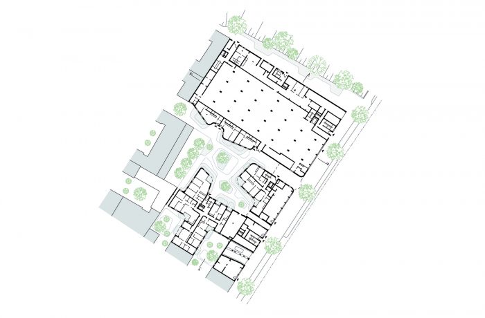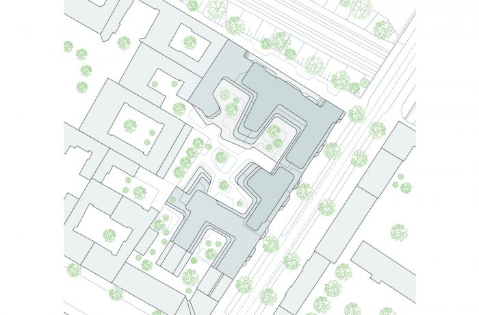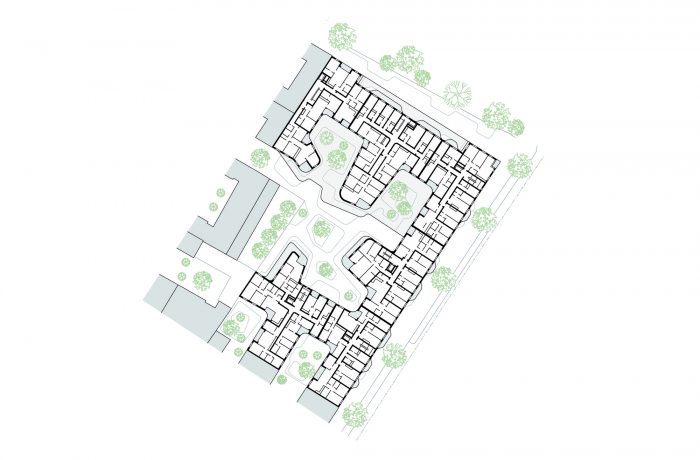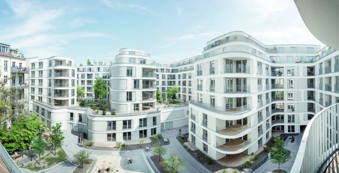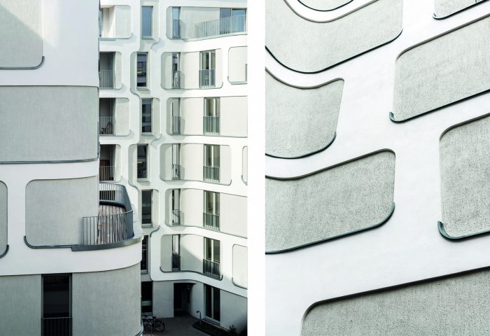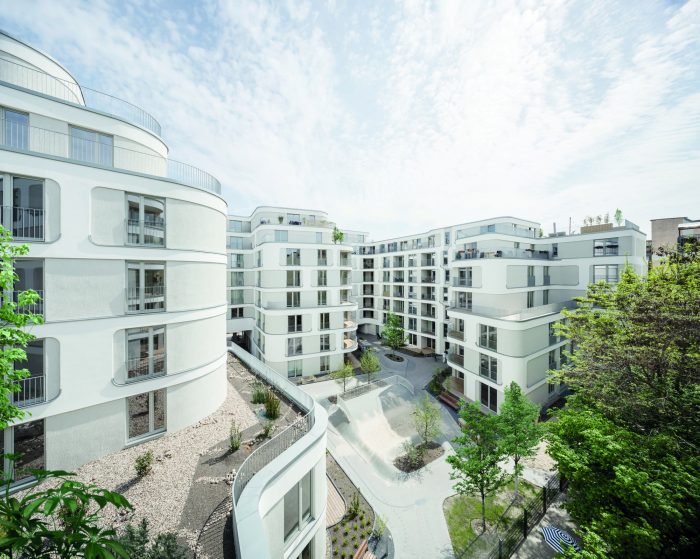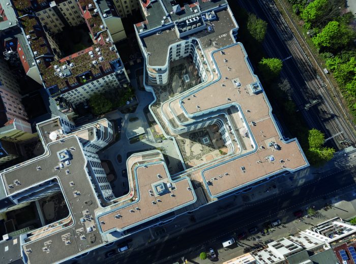 The inside of the block of the six linked buildings terraces a playful, green landscape, resulting in a continuous and at the same time varied interior. Landscaped roof terraces and surrounding private plots combine to form a generous place of retreat in a lively urban environment. This flowing reinterpretation of the Berlin courtyards typical of the Wilhelmine period features views of the neighboring courtyards, resulting in a semi-public intimacy in which the residents of the new quartier can find a way with one another and live as neighbors.