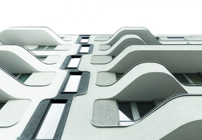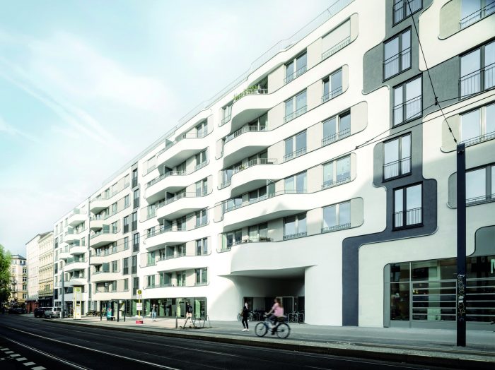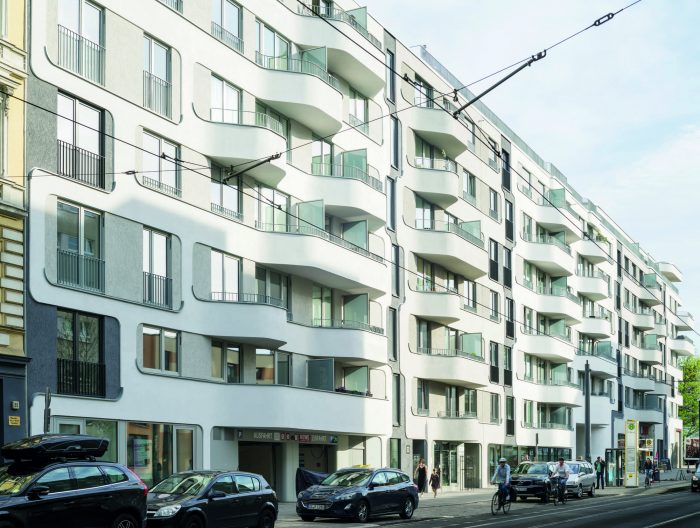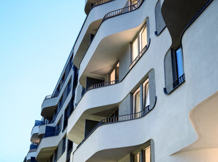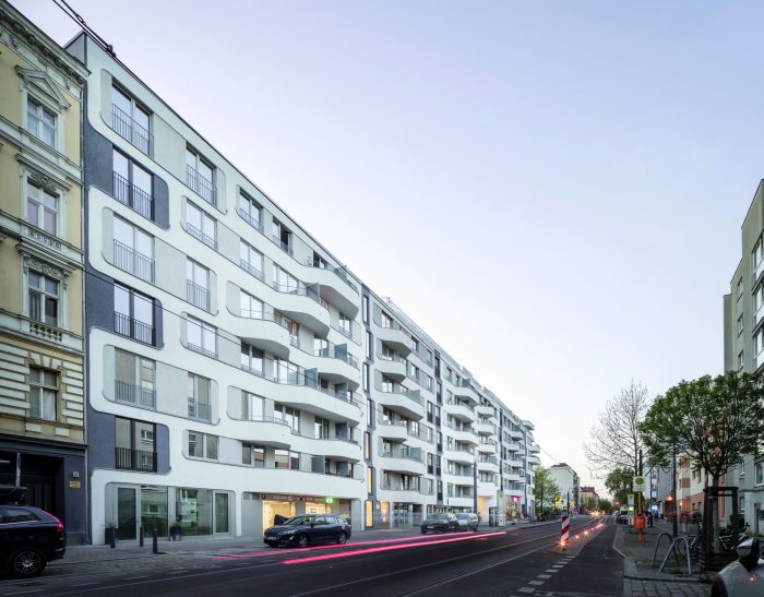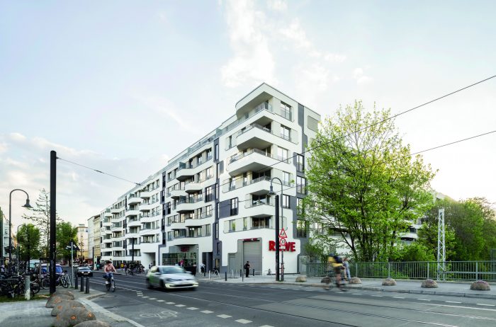 During the post-war period, many of the lots left empty by wartime damage, like this one on Pappelallee, had been filled with single-story supermarkets that are now being torn down and replaced with architecture that combines retail with much-needed housing: Port-o-Prenz is an example of this. It now closes the block, fitting in with the existing architecture and thus complementing the heritage-protected ensemble of buildings around Gethsemane-Kirche. The street draws a straight line to the horizon with a direct view of Berlin’s Television Tower. With Port-o-Prenz, we have succeeded in realizing a project with top living quality, combining closed housing blocks that fit well in the surrounding neighborhood with a generous courtyard; taking account of the limited space available in our cities, and offering a concept that points to the future in regard to the current housing crisis.