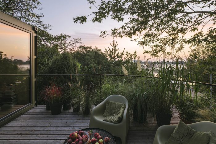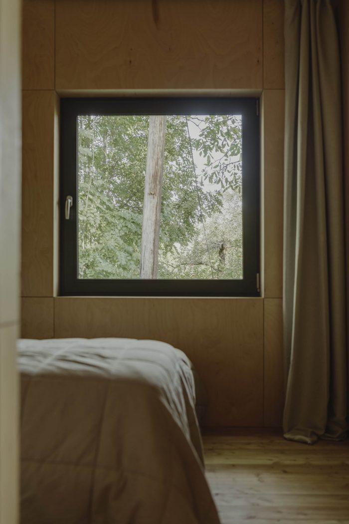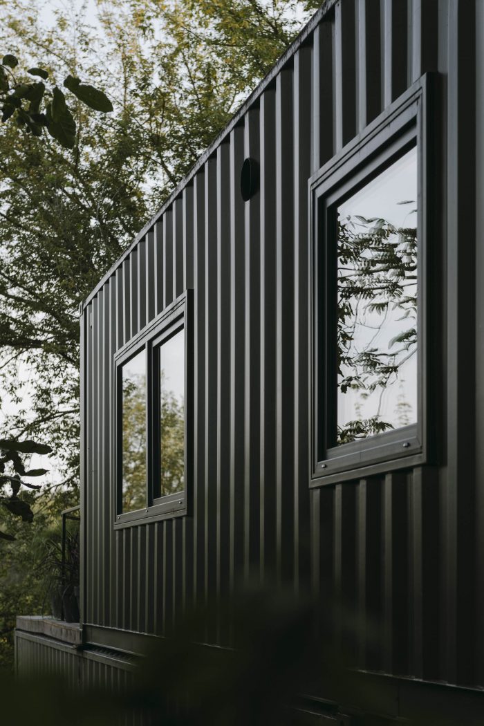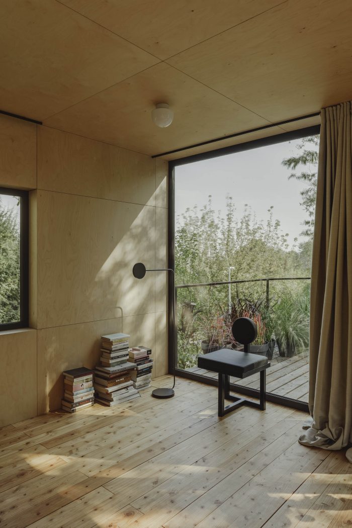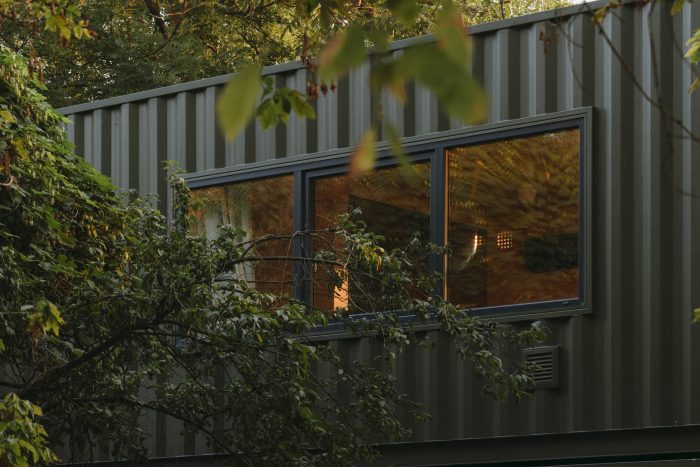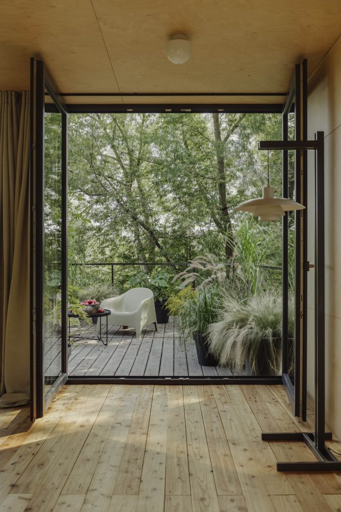 By arranging the function inside, which includes a living room with a kitchen, place to work, bedroom, and bathroom with bathtub, it was possible to obtain a total of 54 m2 of usable space and 24 m2 of space among greenery on the terrace. The walls of the portable cabin are insulated with spray foam and finished with birch plywood, which gives a unique atmosphere inside. By using appropriate materials, it was possible to obtain 2.6 m of internal height in the light and to hide the lintel created when connecting container frames.