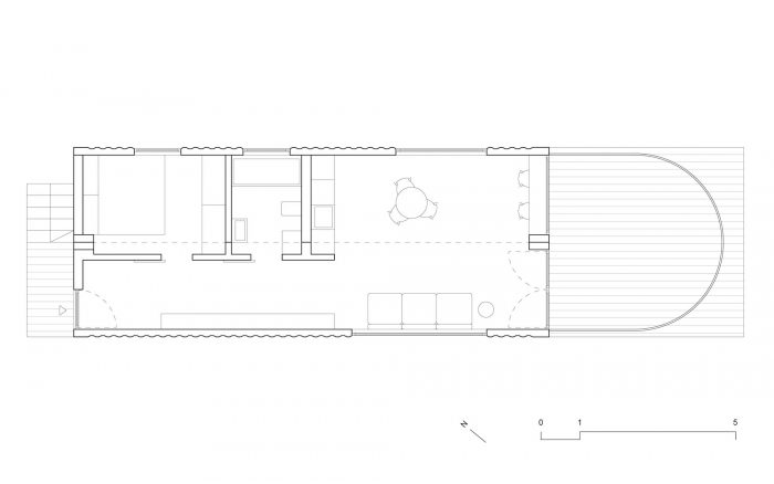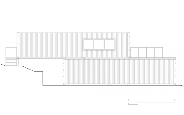 小木屋部分被放置在之前站立的集装箱的屋顶上,这些集装箱作为花园的存储空间。由于地形和景观的倾斜,固体被移开了一半的长度,在一侧创造了一个大的露台,面向附近的河流,在另一侧,它更接近地块,降低了进入地块所需的高度。船舱由两个货运集装箱组成,12 x 2.5米,高2.9米。
