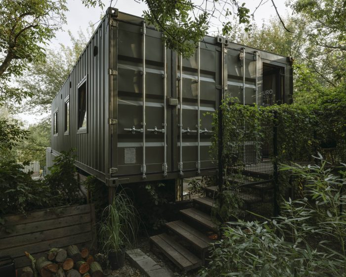 The cabin was partially placed on the roof of previously standing containers, which serve as storage space for a garden. Due to the sloping terrain and views, the solid was shifted by half its length, creating a large terrace on one side facing the nearby river, and on the other side, it came closer to the plot, lowering the height needed to enter it. The cabin consists of two cargo shipping containers, 12 x 2.5 m and 2.9 m high.