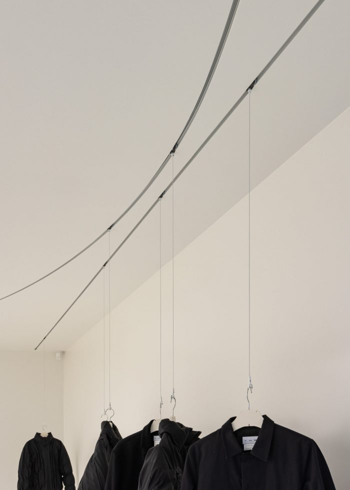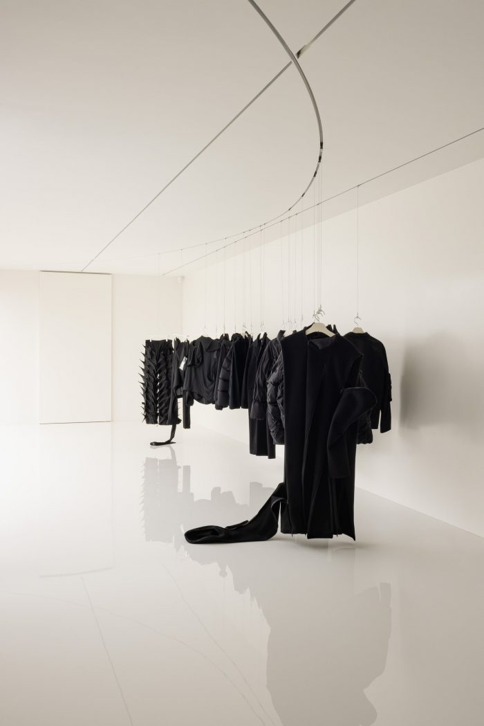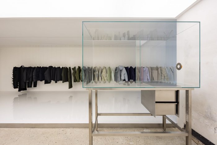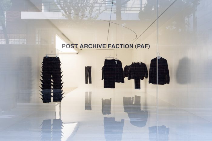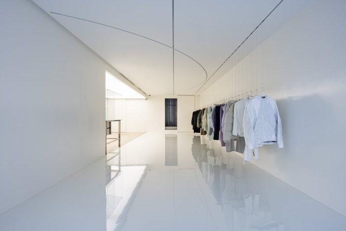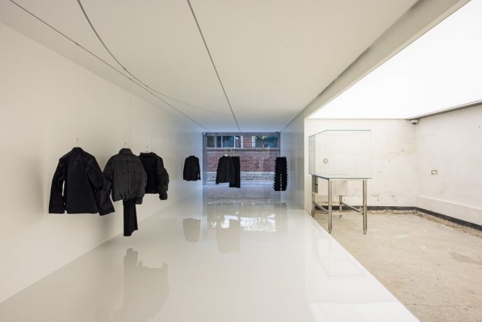 PAF has three line-ups of Left-Center-Right. They constantly take apart and put each other together. The dismantling and coalescing process represent the impermanence of what we deem as “perfect” fashion and space. The spatial duality -constantly battling over the homogenization of the real exteriors and the real interior- of the flagship store captures the resistance spirit of PAF. One may see stripping the space of door handles and interior lights as the esprit de résistance. Their negation only serves to evoke a sense of a transparent vacuum that connects one dimension to another. This bridge, according to the author, further reinforces the spatial mutability of the site, the flagship store, and its reliance on the shifting natural lights.