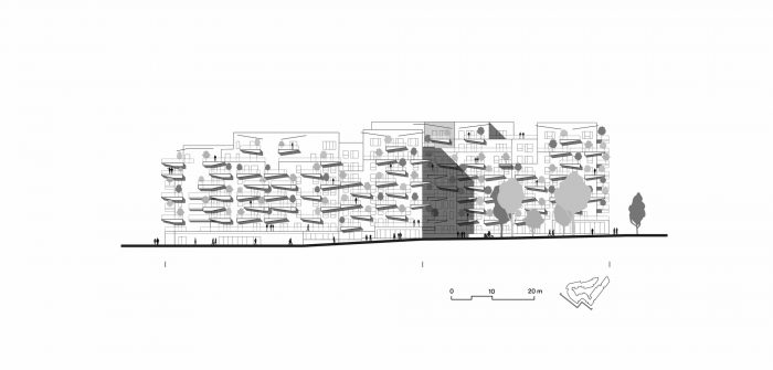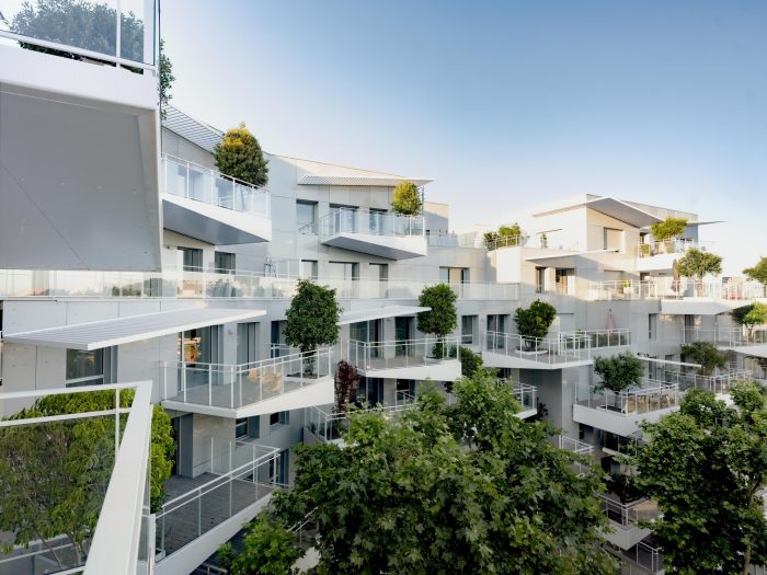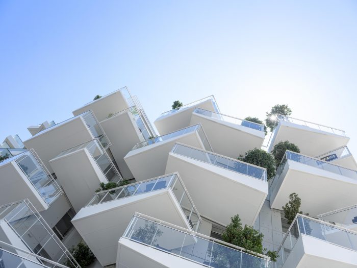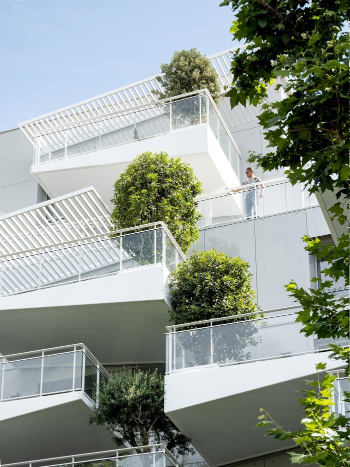To achieve this objective, the project exploits an innovative concept of a large balcony whose triangular geometry with variable cross-section takes up the efforts through cantilevers in line with the tree container built into its thickest part. This high- performance prefabricated concrete component is systematically offset between floors to allow enough air for each tree to grow.