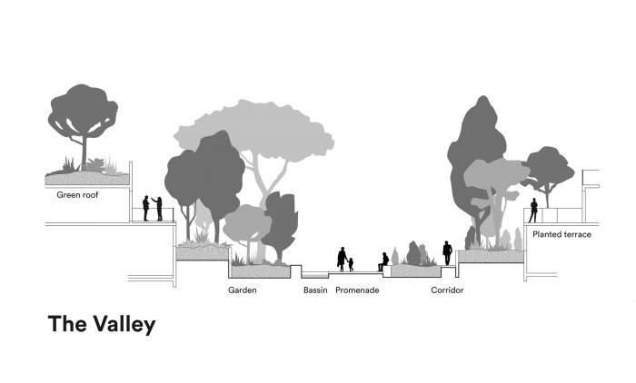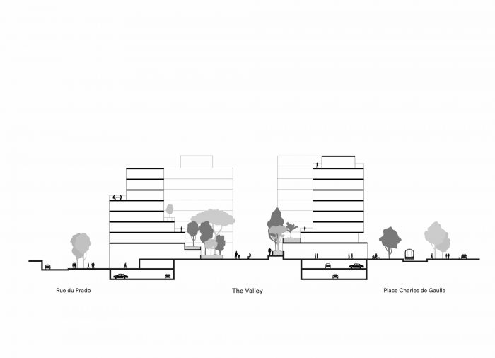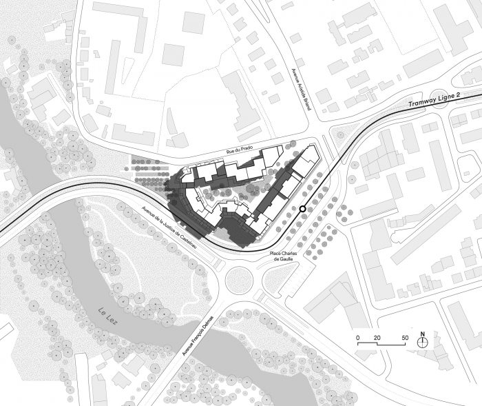 Castelnau-le-Lez is a town located near Montpellier in the South of France which enjoys a very mild Mediterranean climate. The new Prado Concorde development on the edge of the Lez river and at the entry to the town combines collective housing with school facilities and shops in a vast urban island surrounding a garden shaped like a valley.