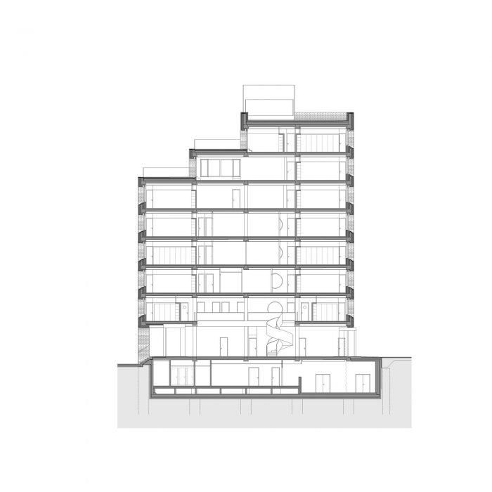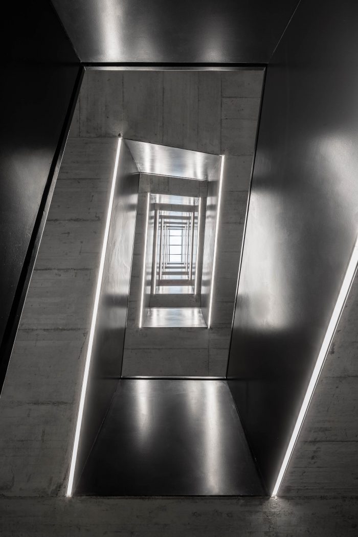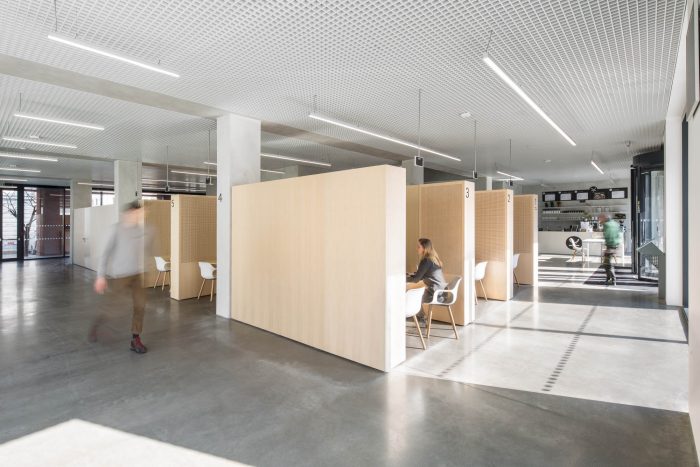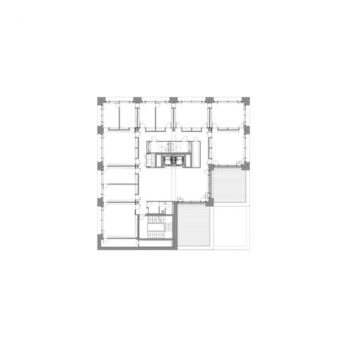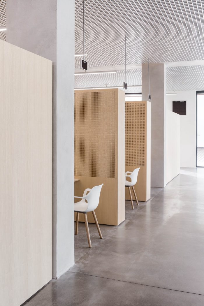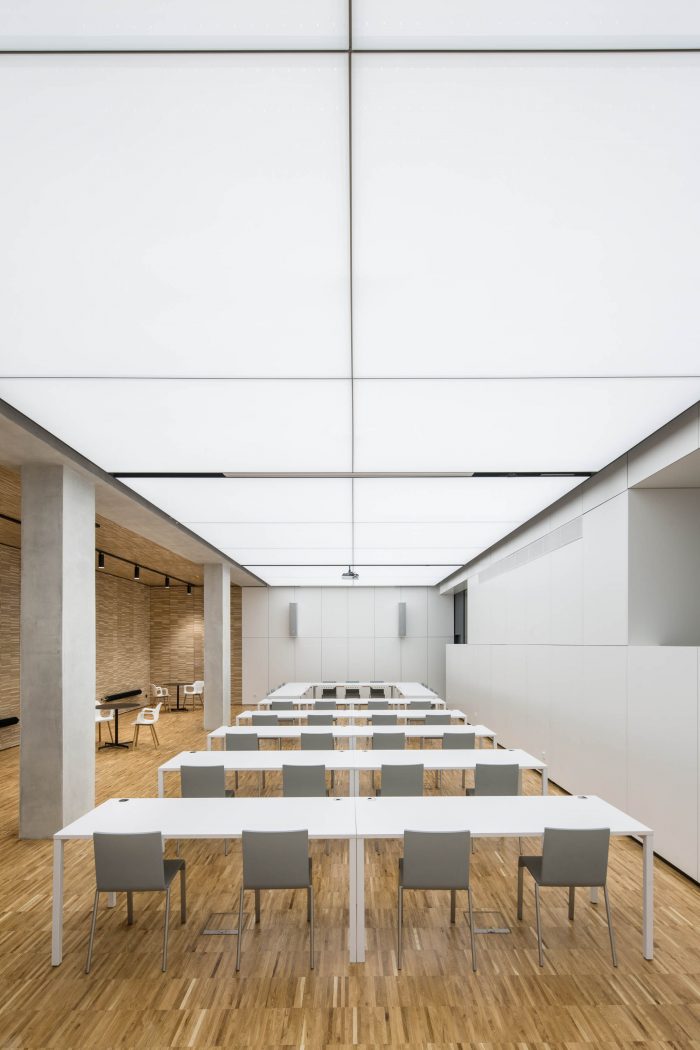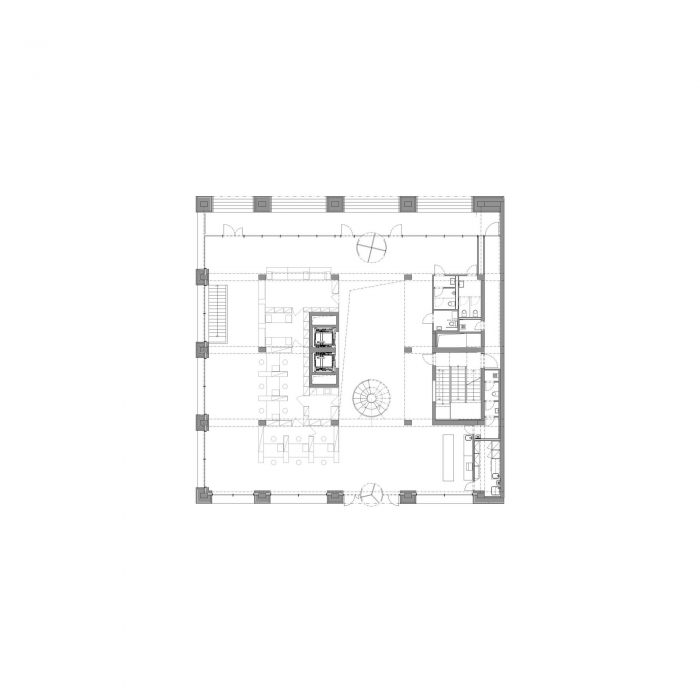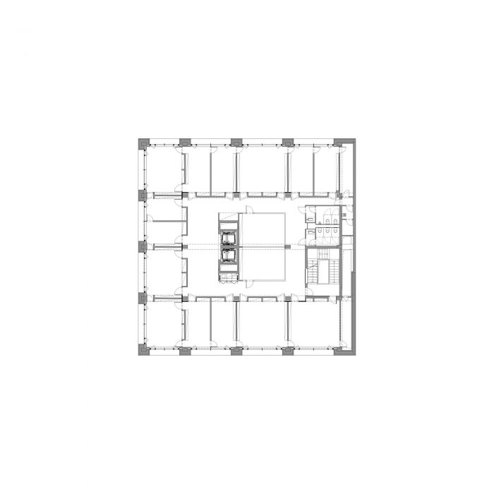 The concept of the building interior is based on rhythms of the spaces following each other. The emphasis is put on the loadbearing structure. The goal is to define a clear boundary between the old and new, between the loadbearing and non-bearing structure. This simple consideration leads to a strict articulation of the corridors. All of the new partition walls never leans on the old structure, the new walls create boxes, which mostly serve as storage spaces for the offices.