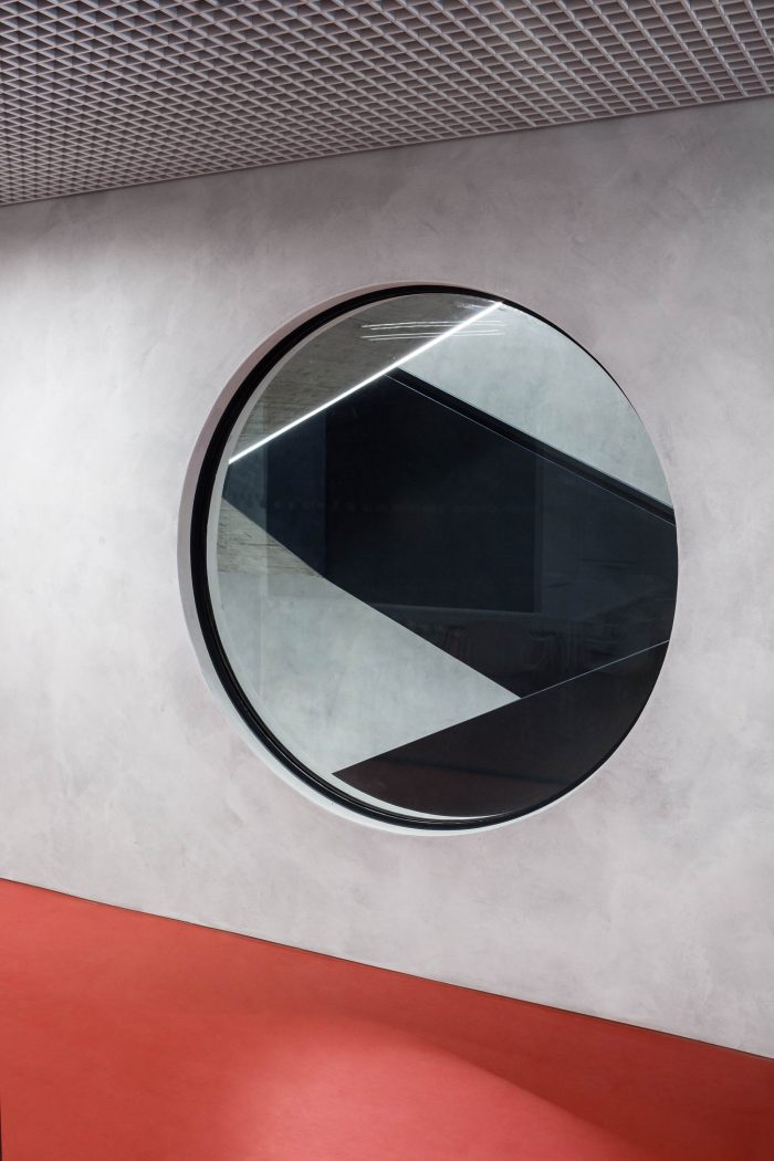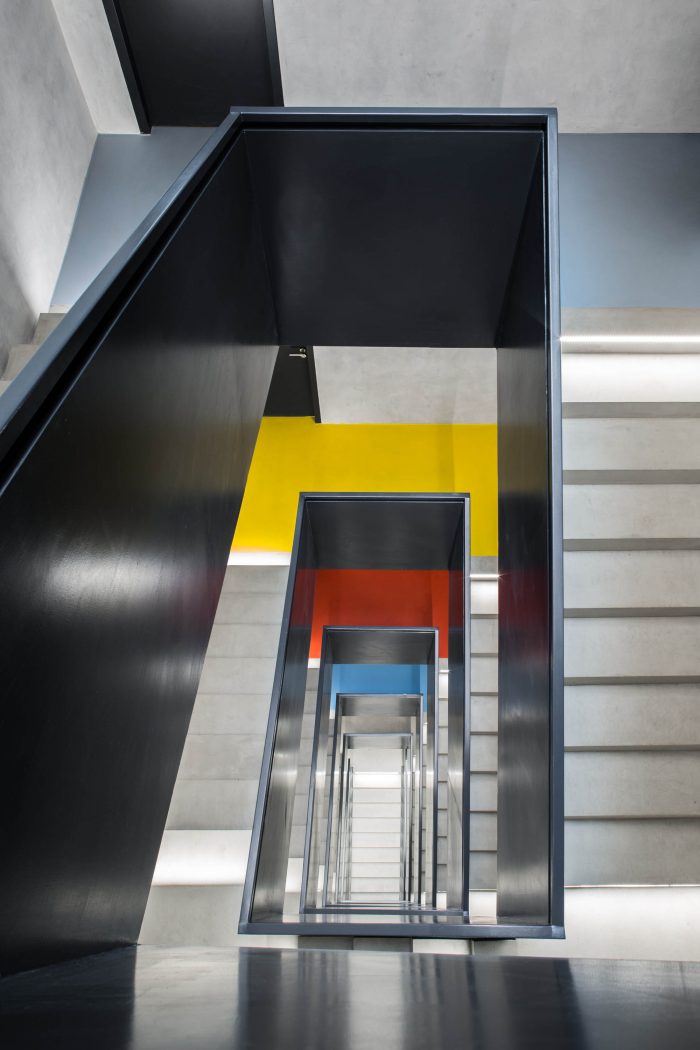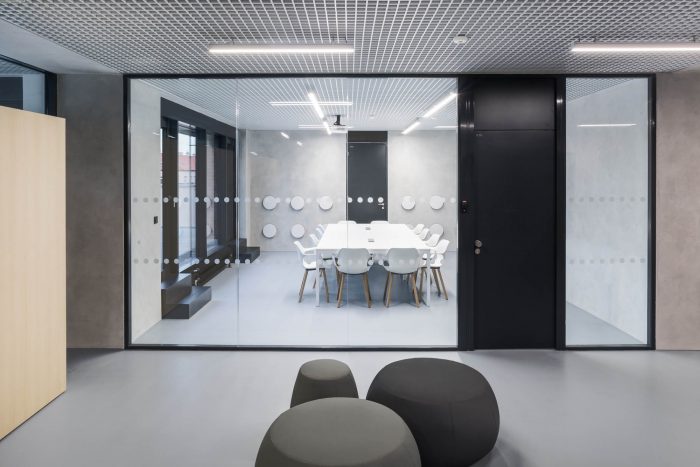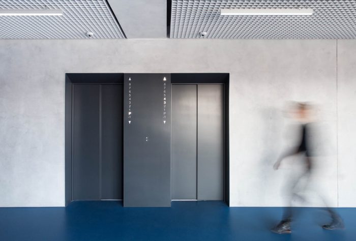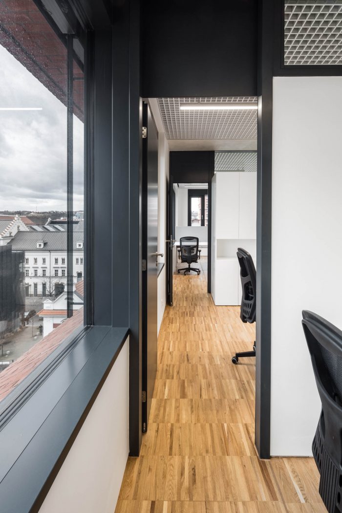 The joining elements which connect the new partition walls and the old structure – the girder and the columns, is represented by doors and transom windows. The natural light is let in the inner corridors thanks to this solution. Each floor has its own color for better orientation. A significant interior element, which connects all the inner spaces, corridors, and rooms, is a metal fake ceiling, which also affects the acoustics and absorbs the noise.