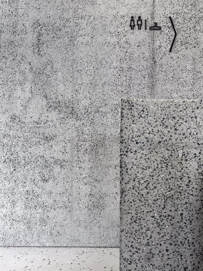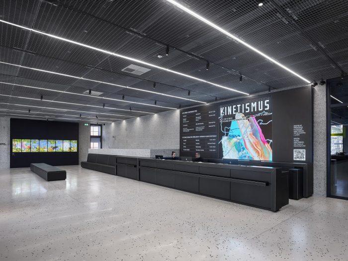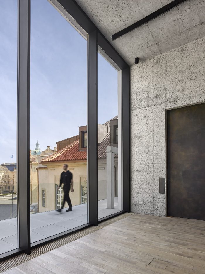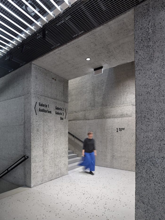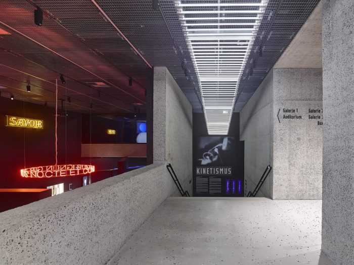 A new entrance to the Kunsthalle has been built, over a footbridge with Prague mosaic paving. At the same time, this conceals the air-treatment technology exhaust pipe needed by transport companies, which has in recent years been entirely inappropriately located in front of the main western facade. In the central section, in the place of the original technological terrace, a one-story extension with a surface finish of sanded terrazzo has been added, whose simplicity does not compete with the original building and at the same time supplements the principle of the retreating segmented facade. Light enters this superstructure through a large window, the proportions of which are derived from the dimensions of the facade.