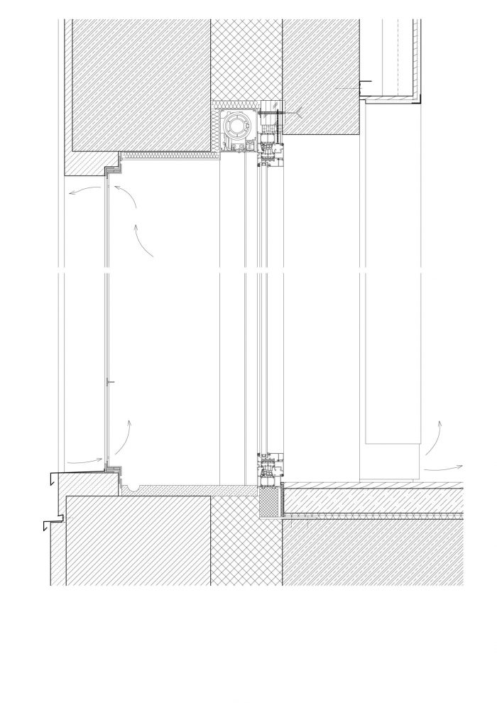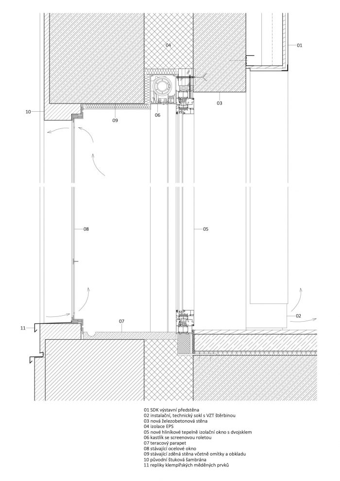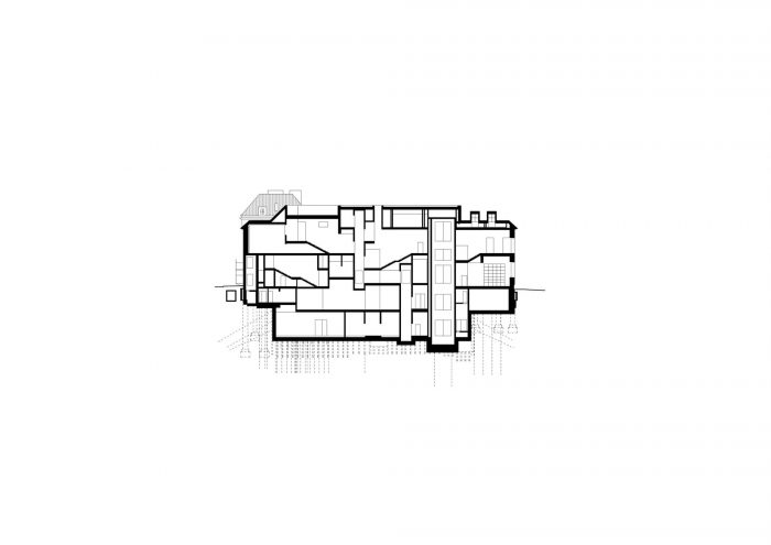 Another source of daylight is a long, atypical skylight on the western ridge of the roof and locally an upper skylight above the lower part of the superstructure. The new design for the central section retains a flat roof, which is segmented by material. Most of the original filling structures of the facade were professionally dismantled and removed before construction work began and returned during conversion. Others were replaced by new structures in the original position and in original shape. For museum purposes, gates for the transport of objets d'art have been added from the north.