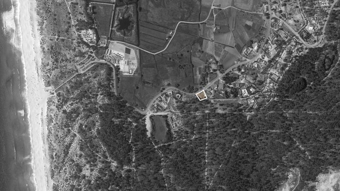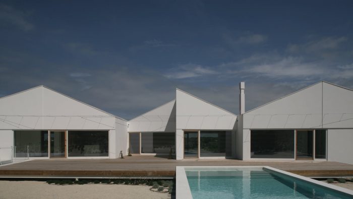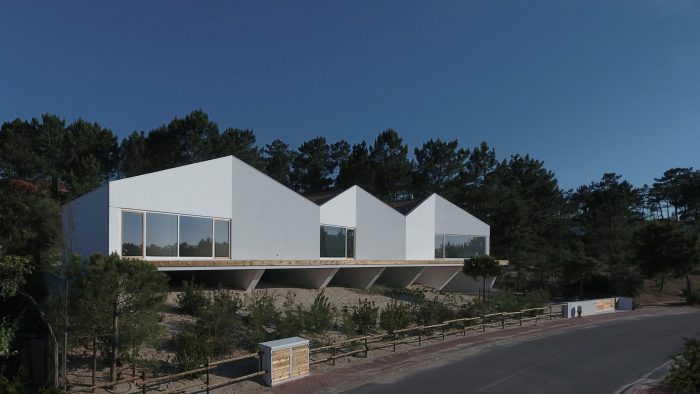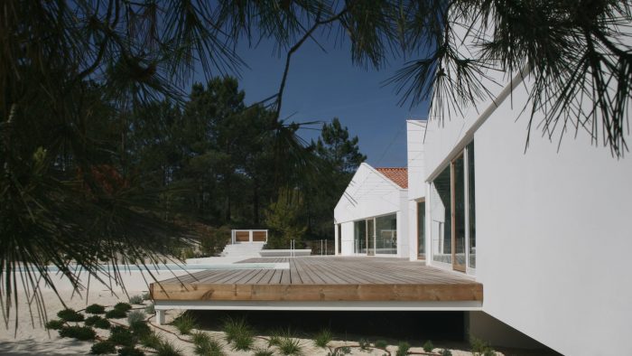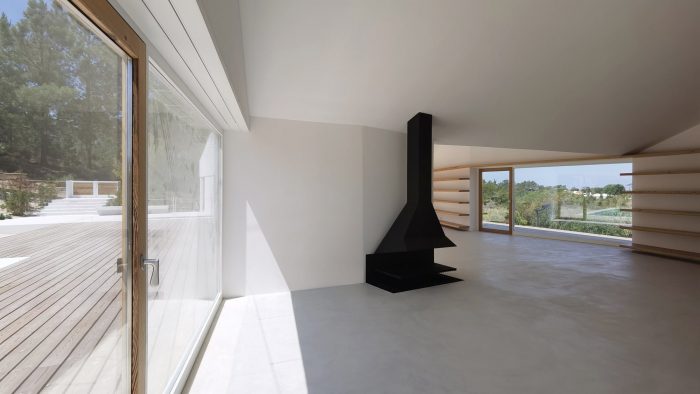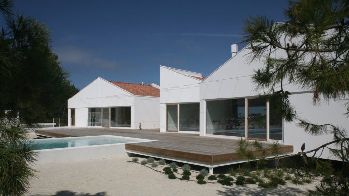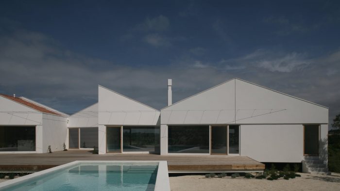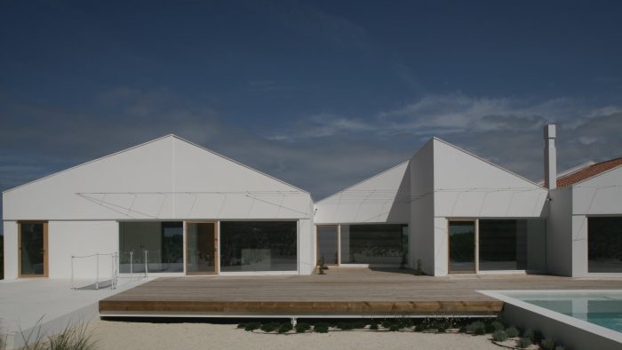 The House in Praia do Pego is located in Grândola, around 900 meters from the coast. The site has an area of 1.239m² that provides a transition from the lower level of the public space, facing north, to a higher level of the site, facing south. It is situated in a residential area of average density, with confining lots facing east and south. Facing north, the site has a clear view of the rice fields. Its west edge confines a small route for pedestrian access. The design of the house bases itself on the interpretation of the site’s configuration. The two lateral limits of the site delineate the direction of the east and west facades, while the position of the house is determined in order to guarantee its elevation from the public street and the creation of an exterior living area at the most private part of the lot. This area is positioned south to optimize the entrance of natural light.