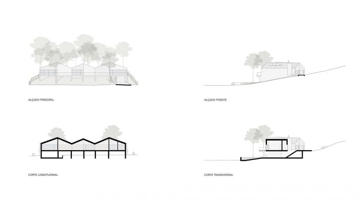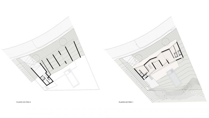 Finally, the design tried to reconfigure the original topography in order to restore the natural slope that connects the lower levels of the public space in the north with the higher levels of the site in the south. The house is placed in a high position in accordance with the south portion of the site, allowing the natural slope to continue naturally until the limit of the property and the house to be elevated from the public space. The two terraces reaffirm this condition: the north terrace follows the entire front of the house and the south terrace integrates the interior to the volume of the pool.