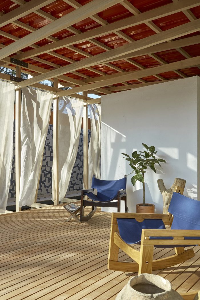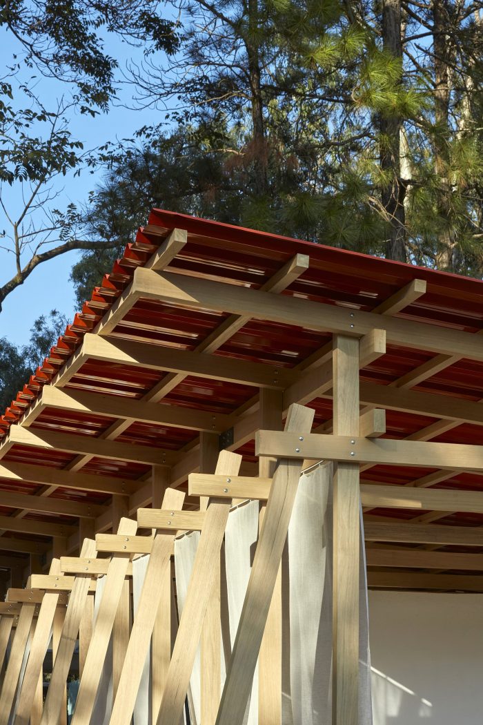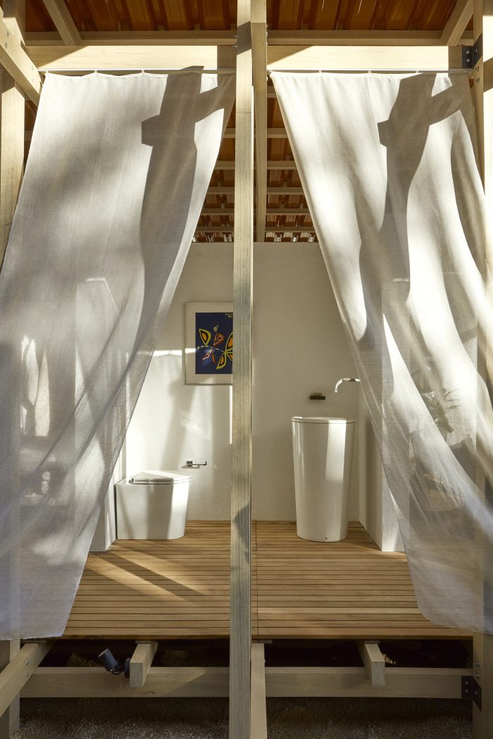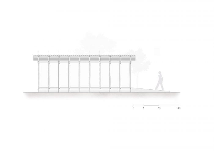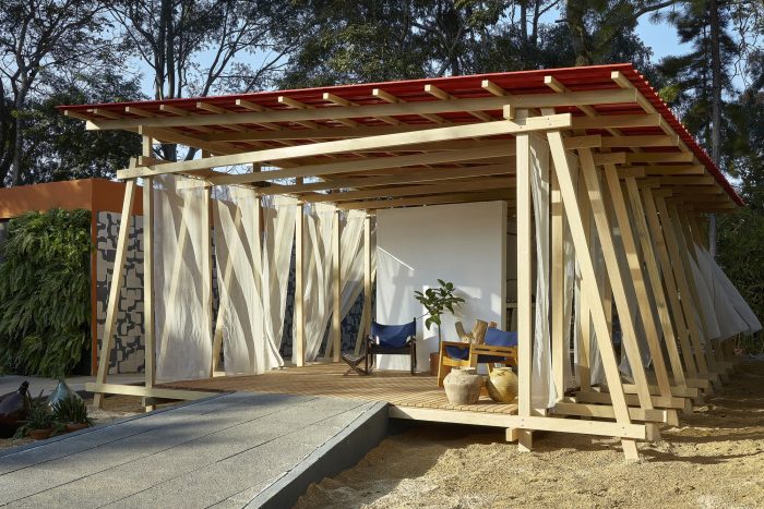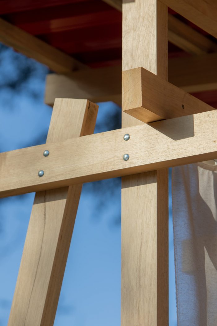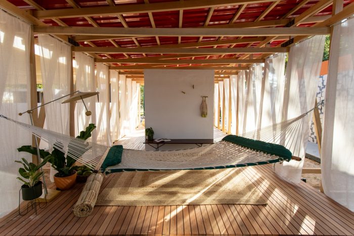 A simple system of wooden poles rises the building from the ground. It addresses a feeling of lightness and fluidity emphasized by its textile envelope. This character enables fast, clean construction and the ability to replicate the building lengthwise in multiple arrangements. Constructive flexibility and structural rationality allow its transposition to any other place at any given time. After the exhibition, the building elements will travel to southern Bahia for reassembly into private seaside accommodation. More than embodied space, it is a proposal of reproducible spatial organization, expanded and set up in many different contexts for different ways of living.
