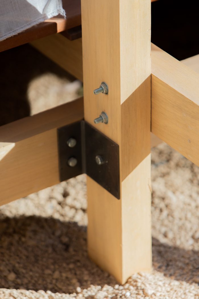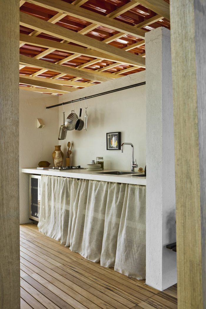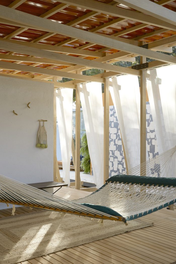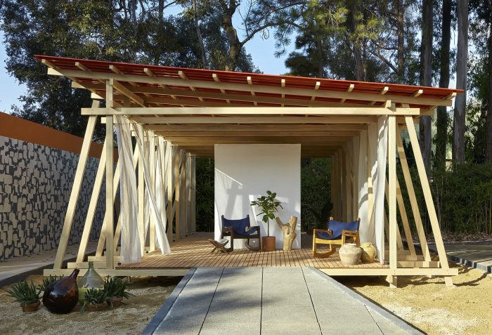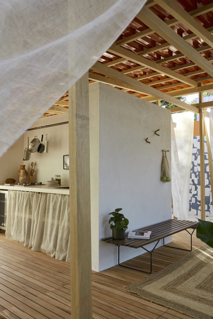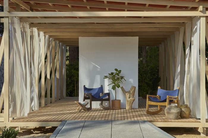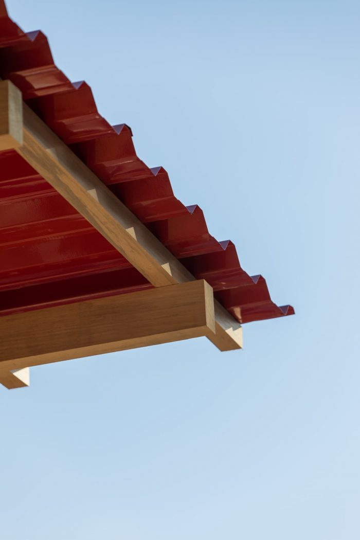 A simple system of wooden poles rises the building from the ground. It addresses a feeling of lightness and fluidity emphasized by its textile envelope. This character enables fast, clean construction and the ability to replicate the building lengthwise in multiple arrangements. Constructive flexibility and structural rationality allow its transposition to any other place at any given time. After the exhibition, the building elements will travel to southern Bahia for reassembly into private seaside accommodation. More than embodied space, it is a proposal of reproducible spatial organization, expanded and set up in many different contexts for different ways of living.