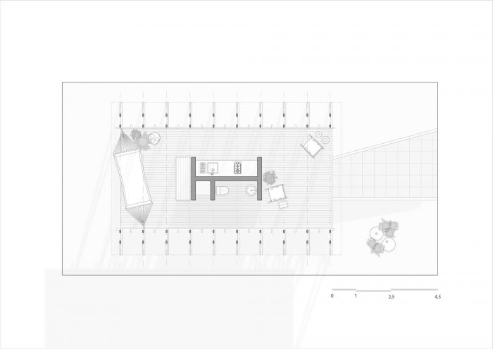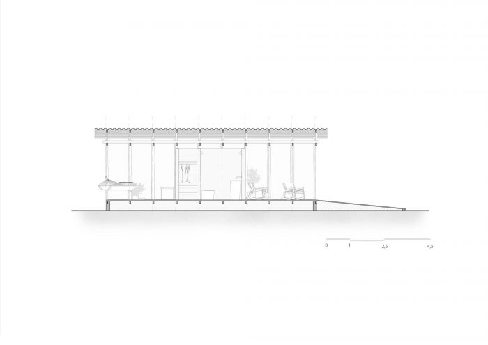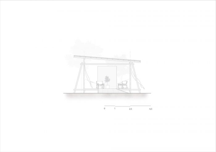 Tectonics emerge as the design guideline since the structural elements propose an architectural solution. The proposition aims to establish a support place for users that encourage the relationship between the built environment and nature. The surroundings take part in this equation. Permeability dissolves the border between inside and outside, inviting the landscape to inhabit the design. Strictly modular, the volume unfolds in three spaces that mediate inside and outside: living room, bathroom/kitchen, and bedroom. The rigid core alone acts as the infrastructure, so the other spaces are flexible and accommodate any activity necessary. This strategy not only keeps costs low but frees the building spaces.